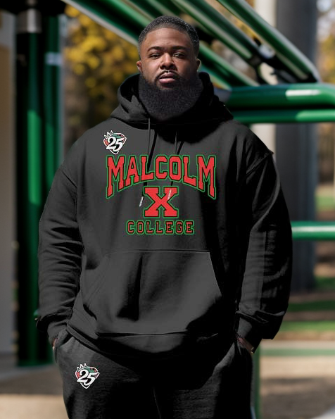 Featuring a bold "Malcolm X College" graphic print, this men's black hoodie set is perfect for sporty fashion. This sporty design brings a touch of urban style, making it perfect for any casual outing. The loose fit offers maximum comfort, especially for those who prefer a roomier style. It combines fashion and functionality, ensuring you look great while staying cozy.