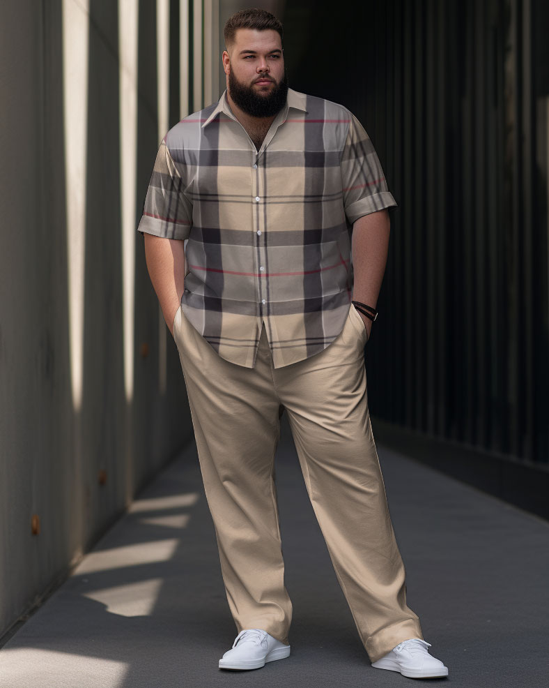 Embrace the classic plaid and reminisce the retro charm in walking sets. This set showcases the classic , and the khaki color adds a retro and simple style. The loose-cut design provides excellent comfort for large men. It is an ideal choice for any man who is in pursuit of a fashionable and simple style.