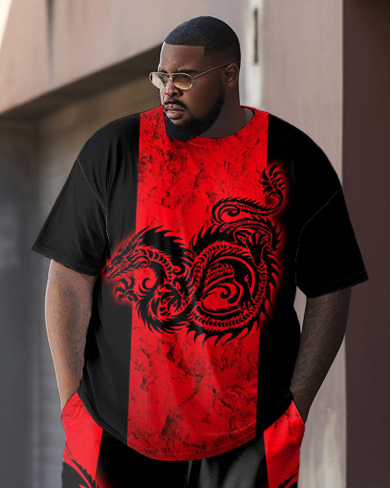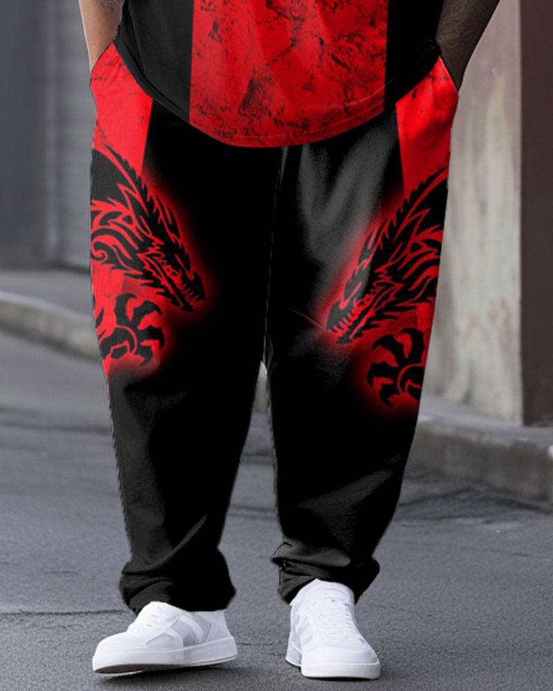 Men's Plus Size Red And Black Color Block Dragon Totem Print T-shirt Trousers Suit