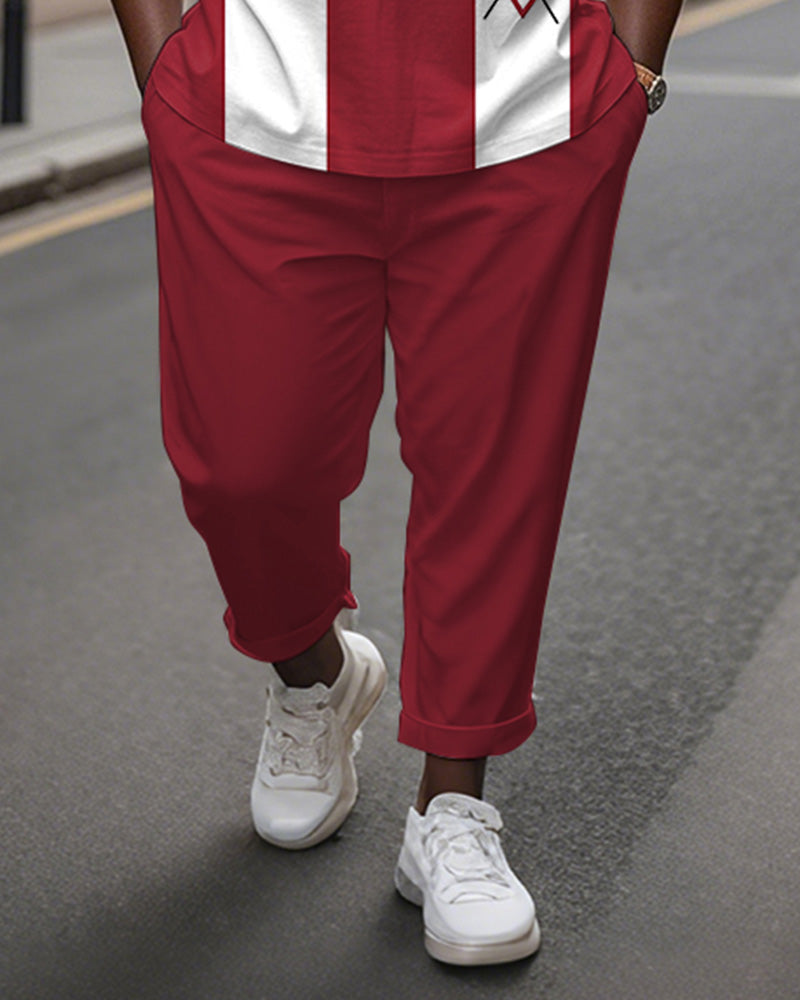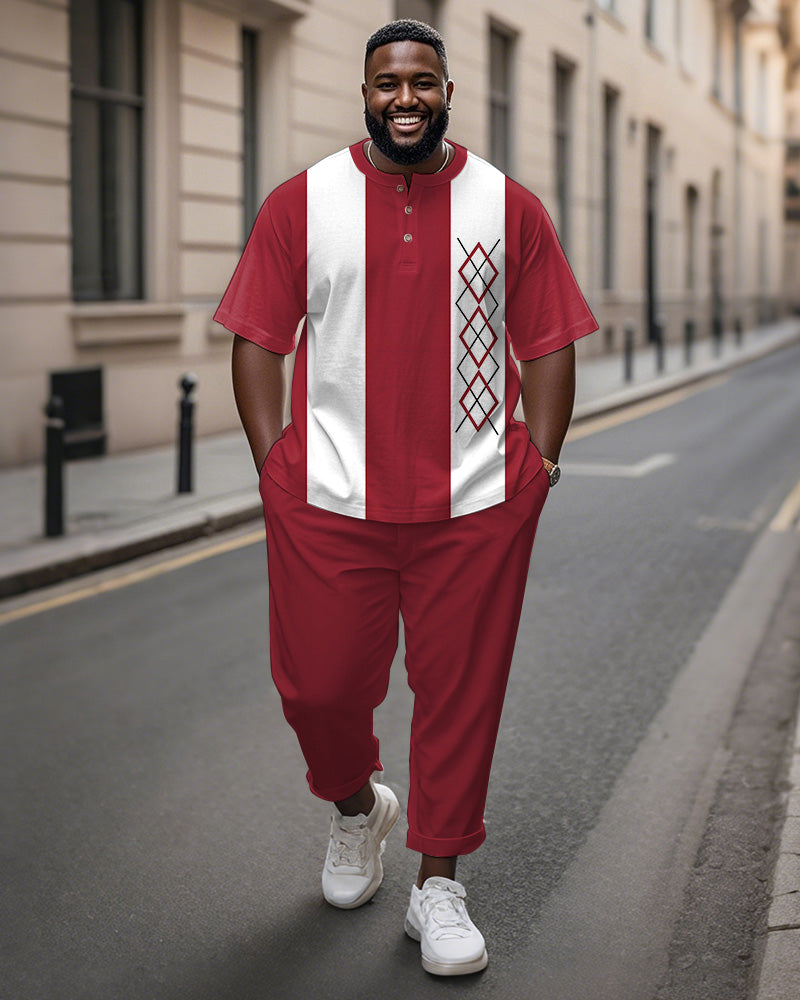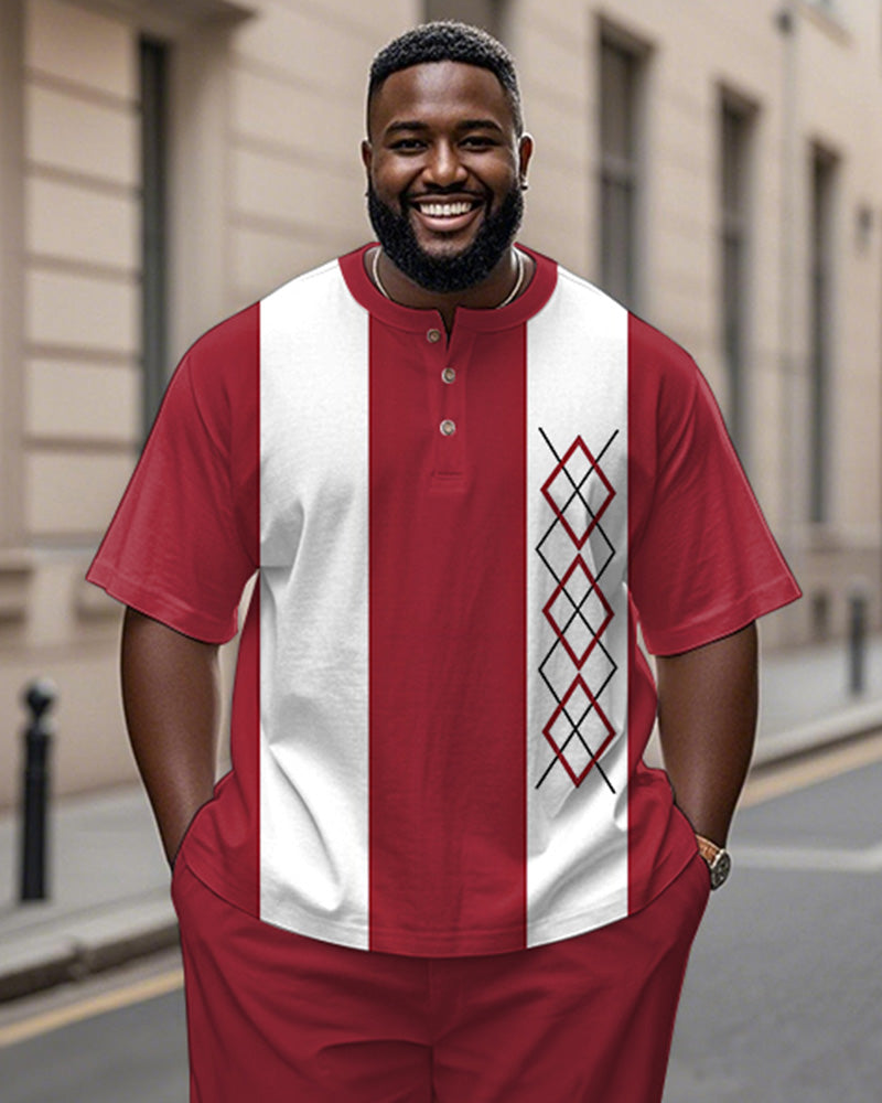 Men's Plus Size Red And White Color Block Geometric Print Henry Collar T-shirt Trousers Suit