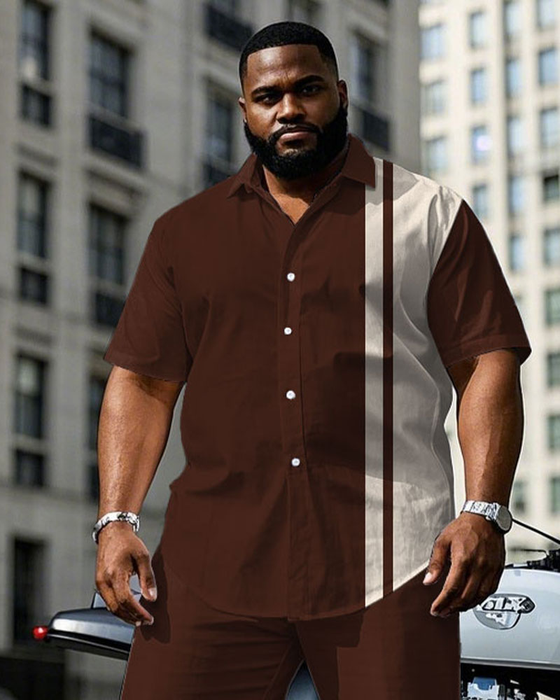 Men's Plus Size Red Brown & Apricot Colorblock Short Sleeve Shirt Pants Suit