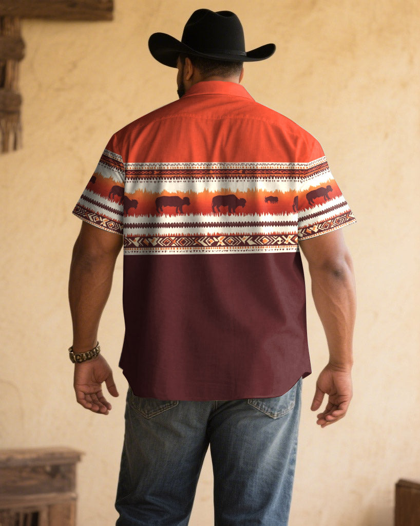 Men's Plus Size Red Color Block Animal Pattern Western Denim Print Short Sleeve Shirt
