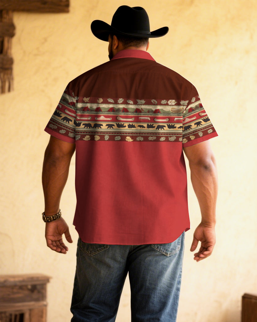 Men's Plus Size Red Western Denim Ethnic Pattern Printed Short Sleeve Shirt