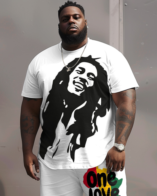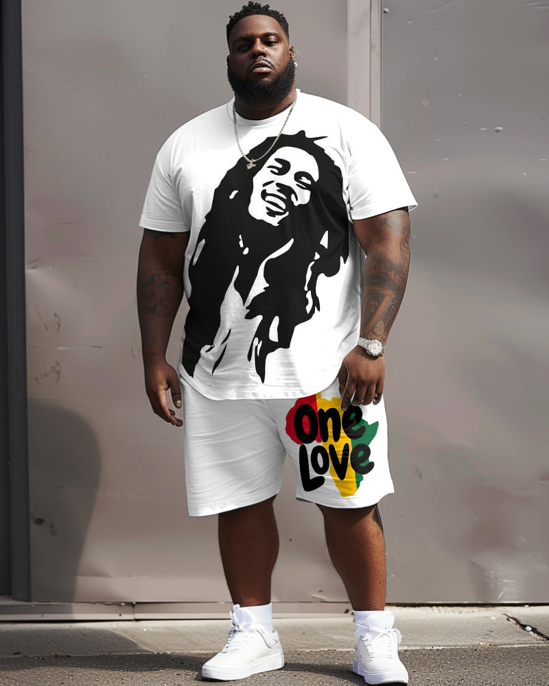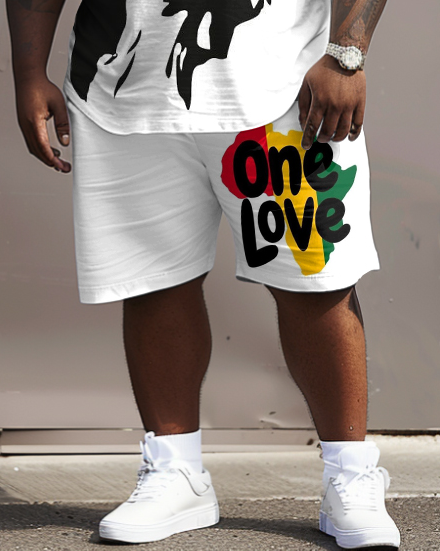 Simple yet stylish, this big men's white two-piece set celebrates reggae music in style. The bold reggae graffiti print and the iconic "ONE LOVE" lettering will catch your eye. It carries a deep message of unity and love. This set is good for laid-back streetwear and versatile for multiple occasions.