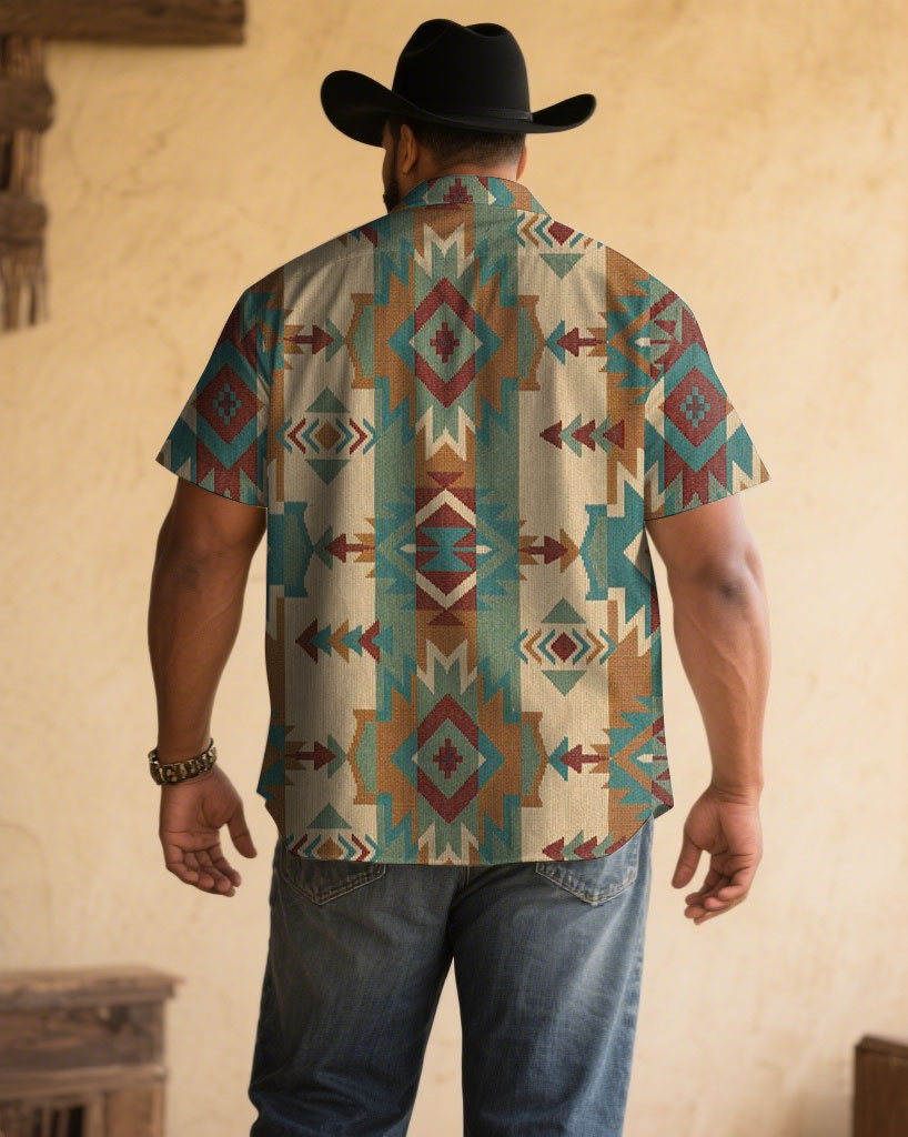 Men's Plus Size Retro Western Denim Ethnic Classic Color Print Short Sleeve Shirt