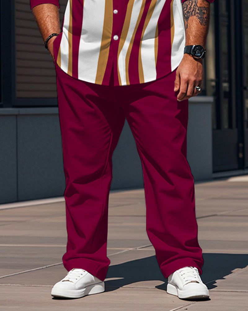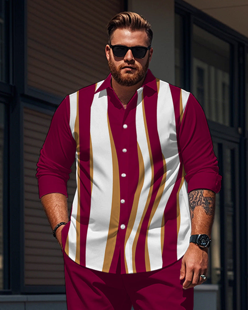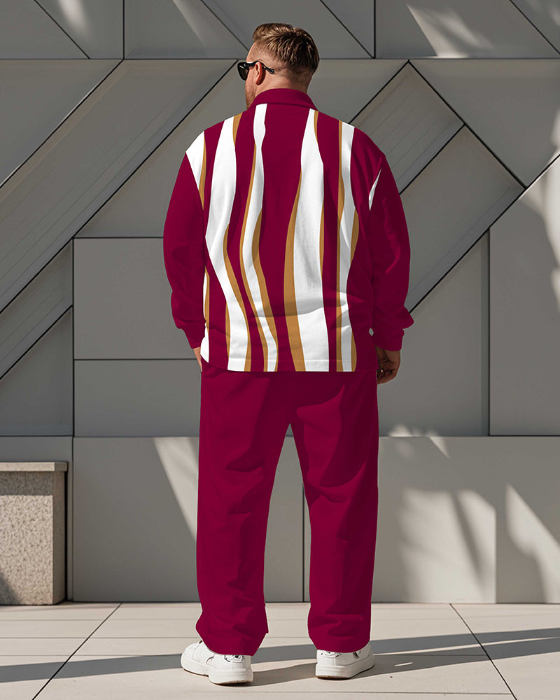 Men's plus size suit with bold and eye-catching colours. Rose-based colour blocking design, passionate and exuberant, wave stripes dynamic and playful, irregular prints add artistic atmosphere, instantly get rid of dull. Long-sleeved shirt with slim trousers, plus-size version of the hidden meat thin, everyday body, easy to highlight the men's distinctive and confident and unrestrained style of dress.
