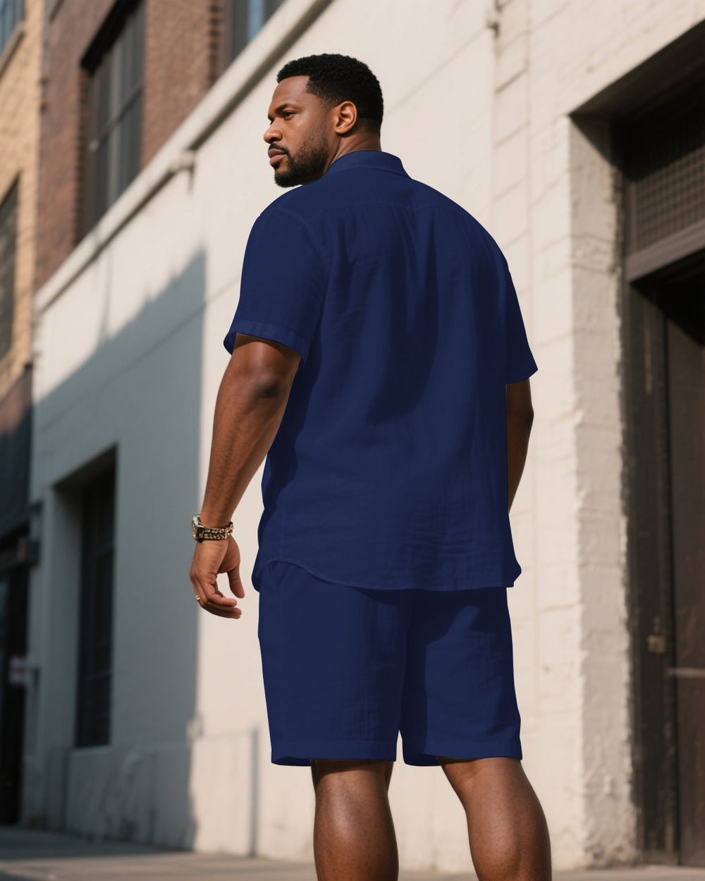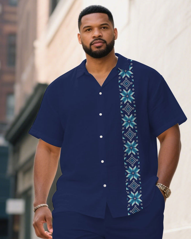 Men's Plus Size Royal Blue Patchwork Bohemian Pattern Short Sleeve Shirt Shorts Suit