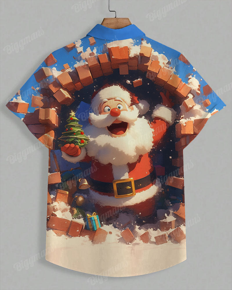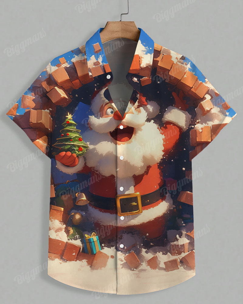 This shirt features a Christmas element pattern with a cartoon of Father Christmas breaking through the wall and holding a Christmas tree . It is usually made of soft and comfortable fabric to ensure comfortable and breathable wearing.