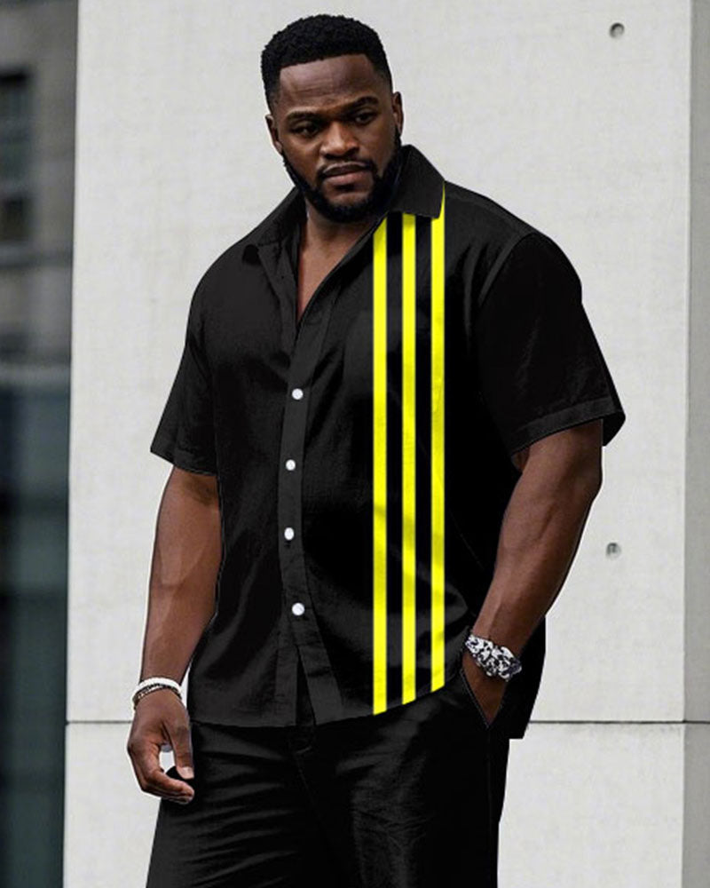 Men's Plus Size Simple Black & Yellow Color Matching Stitching Short-sleeved Shirt Trousers Suit