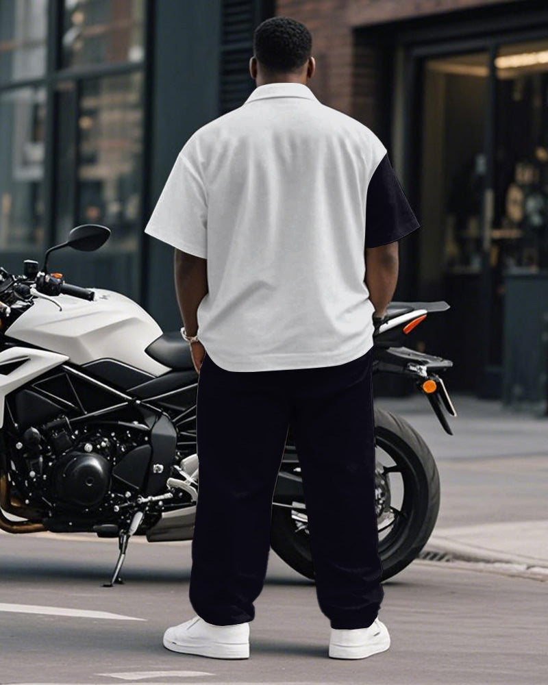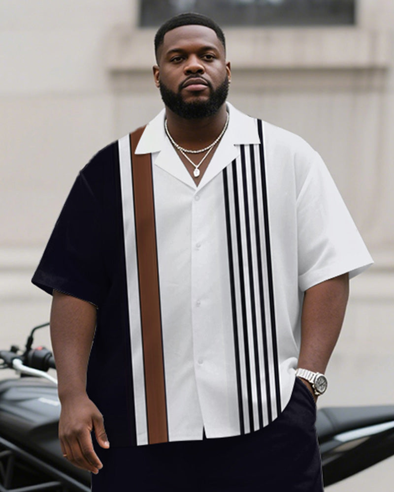 Men's Plus Size Simple Blue Brown Color-block Stripe Printed Short-sleeved Shirt Trousers Suit