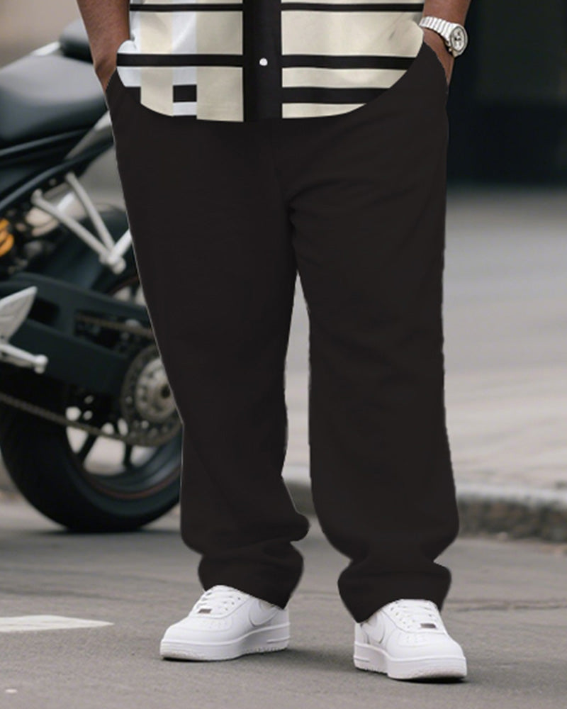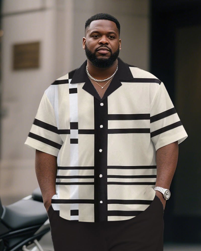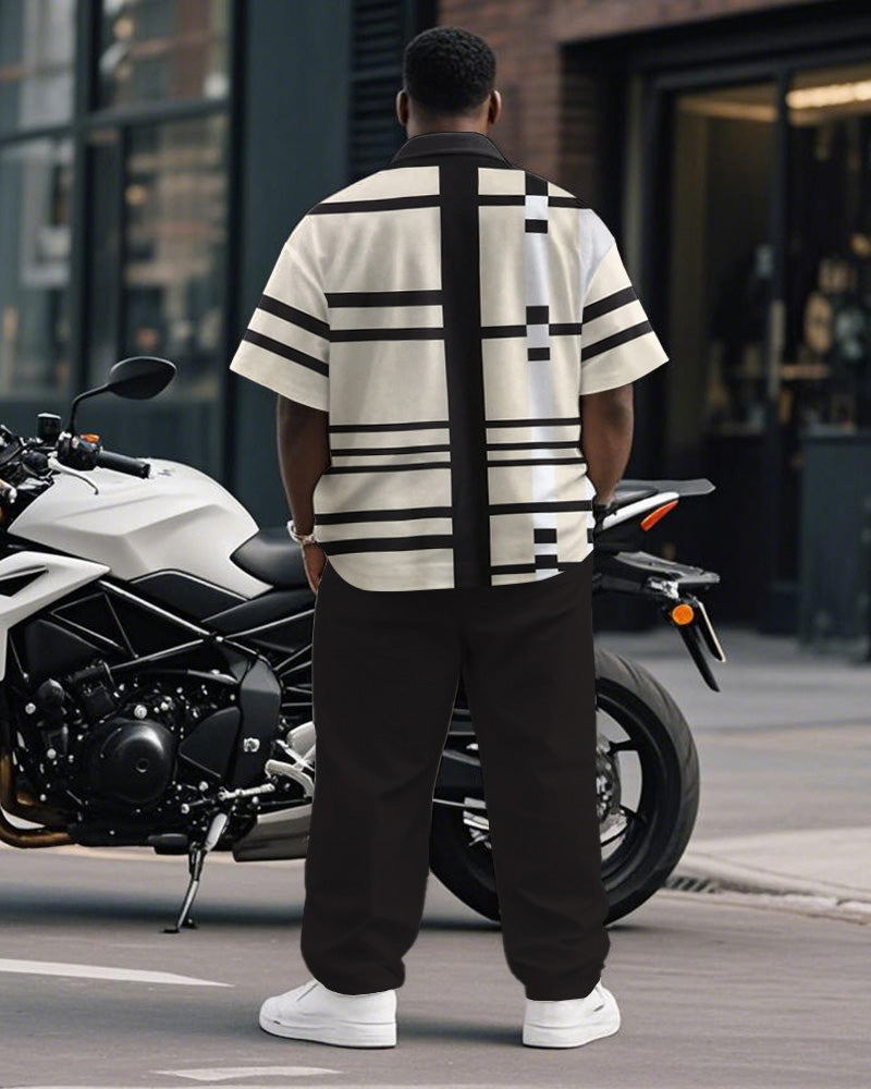 Men's Plus Size Simple Brown Apricot Color-block Striped Printed Short-sleeved Shirt Trousers Suit