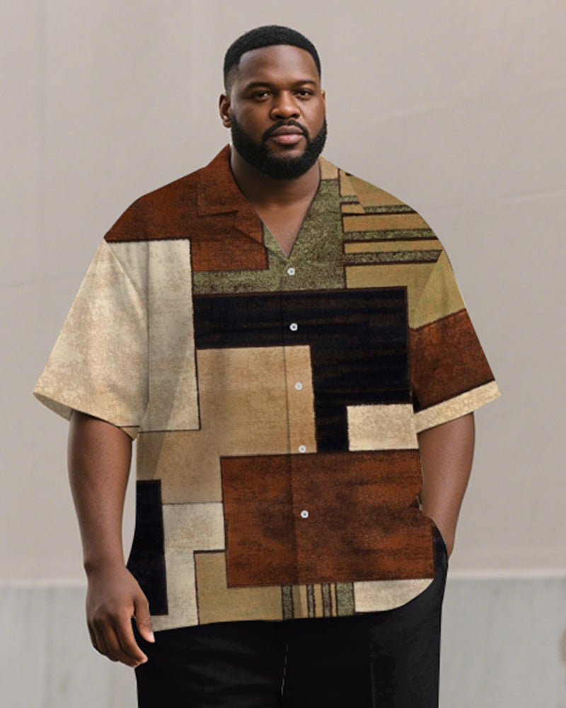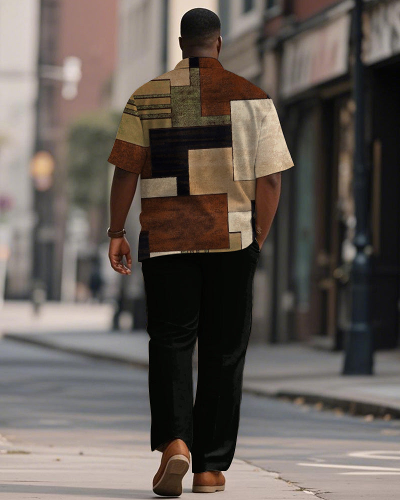 Men's Plus Size Simple Brown Color Block Print Short Sleeve Shirt Trousers Suit
