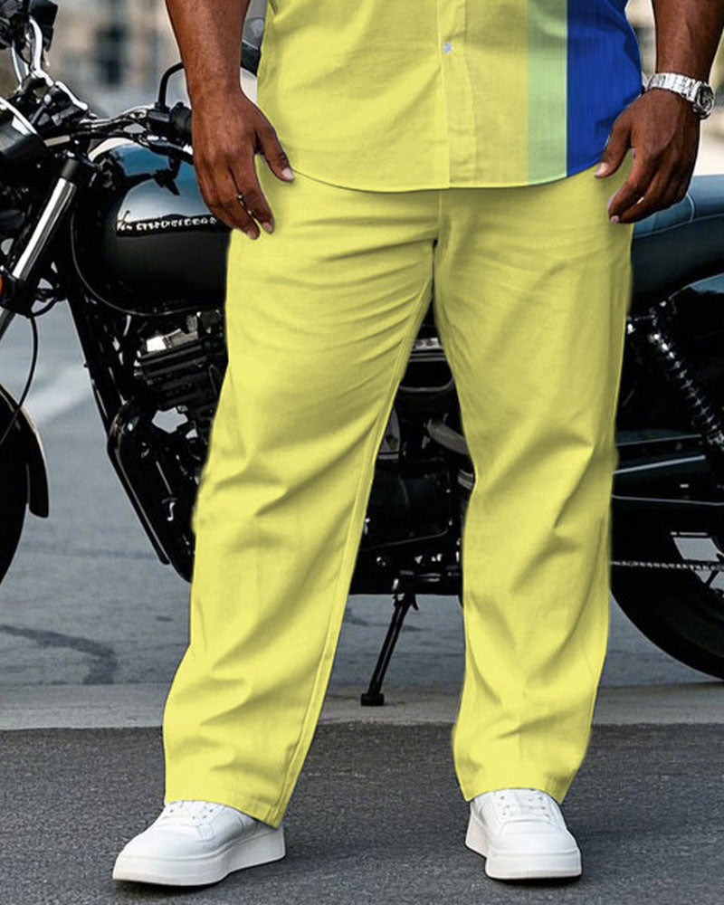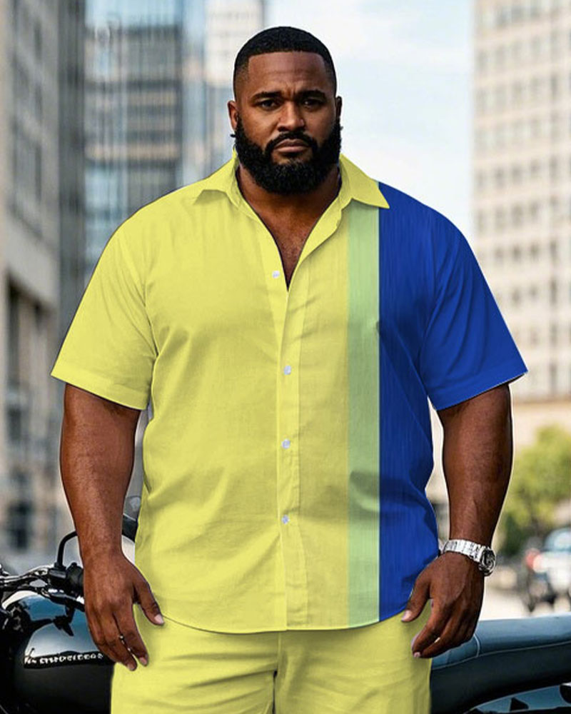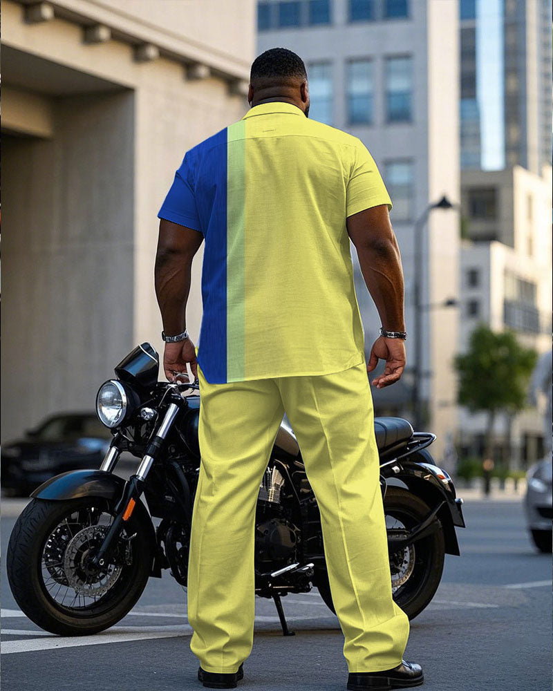 Men's Plus Size Simple Casual Blue & Yellow Colorblock Short Sleeve Shirt Pants Suit