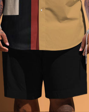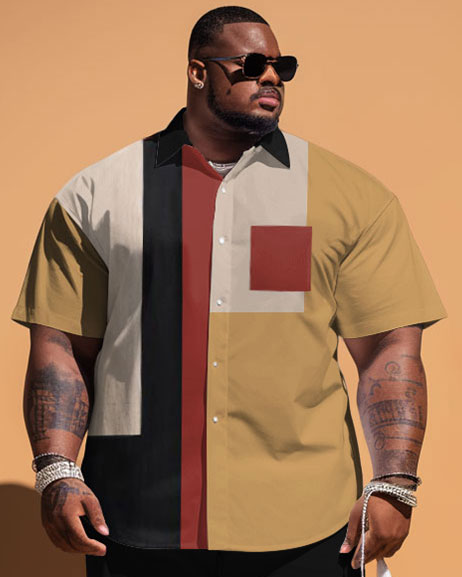 Men's Plus Size Simple Geometric Patchwork Printed Pocket Short Sleeve Shirt Shorts Suit