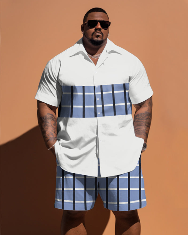 Featuring a color block splicing style, this big men's two-piece set brings you a different visual feast. The refreshing blue and white hue is like the summer sea breeze, while the plaid style shows classic fashion and modern art. Its loose version ensures comfort, suitable for various summer leisure activities.