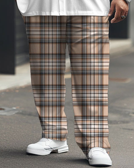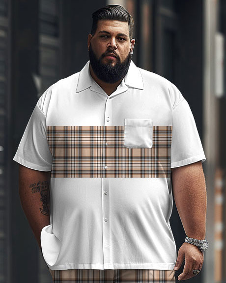 Men's Plus Size Simple Plaid Patchwork Printed Short-sleeved Shirt Suit