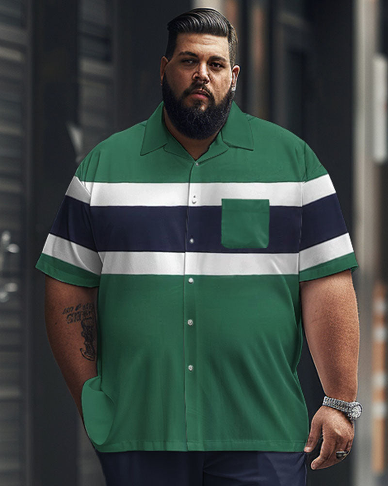 Men's Plus Size Simple Striped Color Matching Printed Pocket Short Sleeve Shirt Suit
