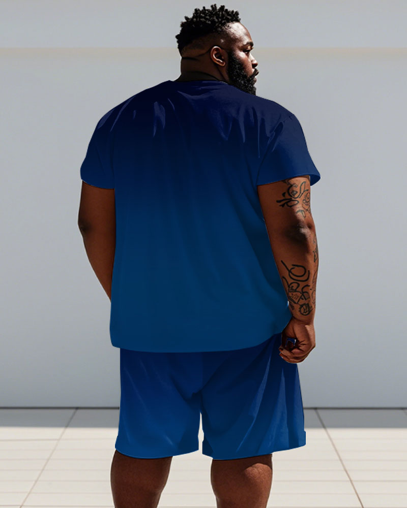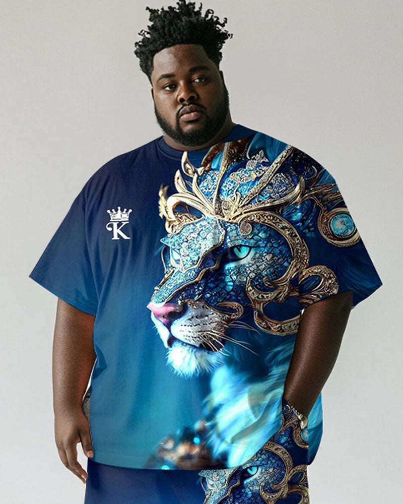 Men's Plus Size Street Blue Leopard Letter Print Short Sleeve T-Shirt Shorts Suit