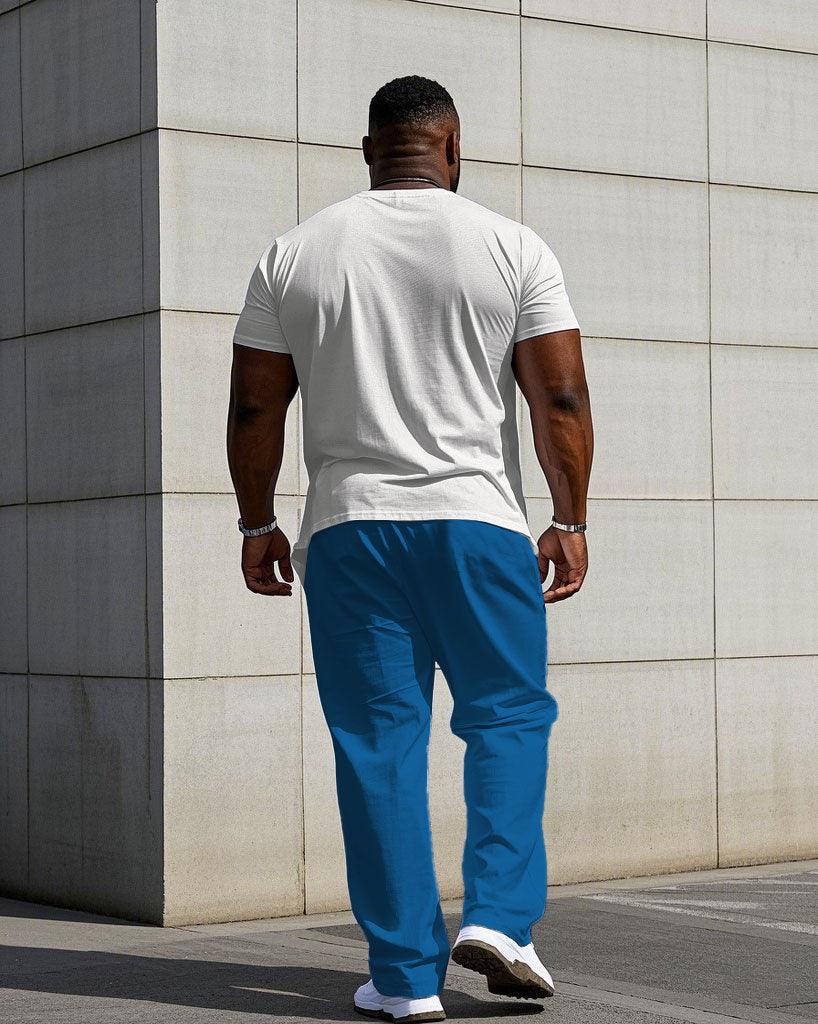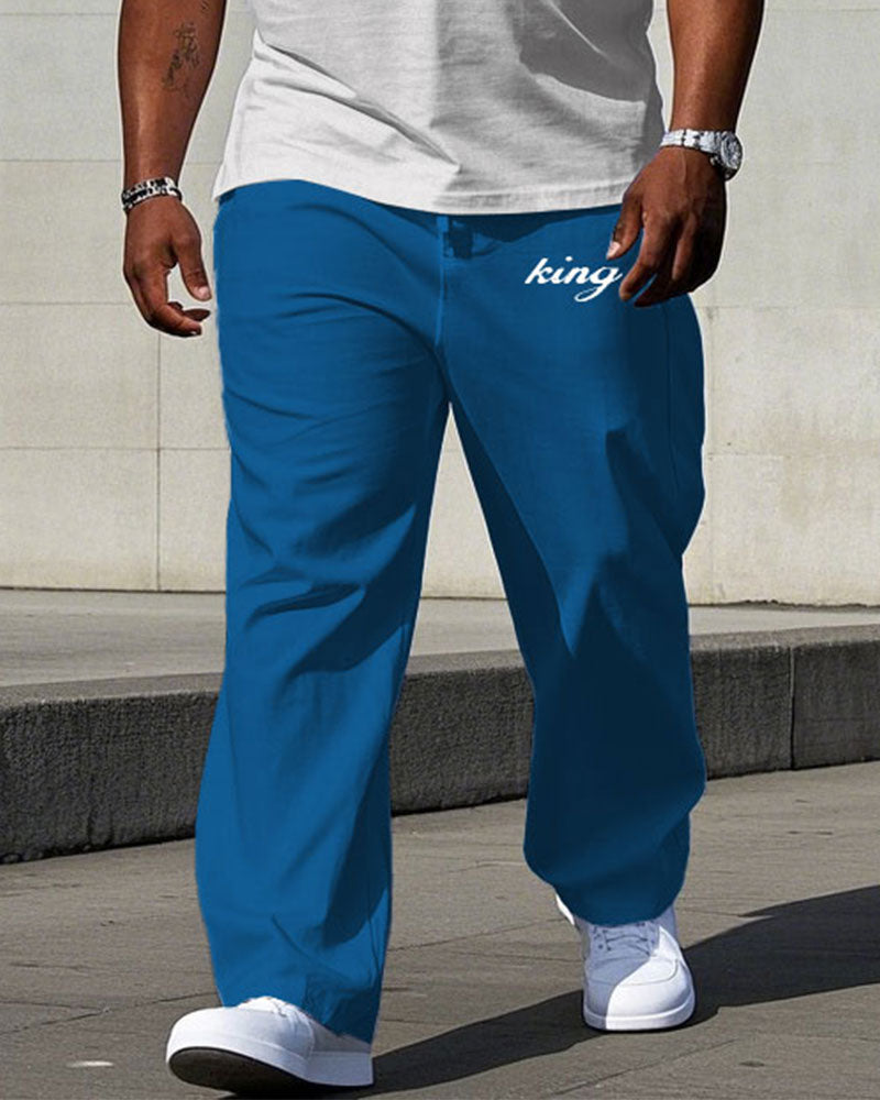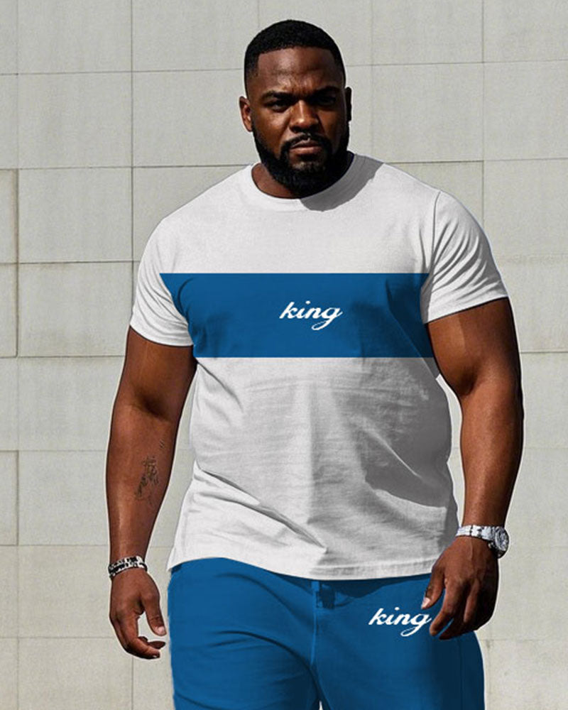 Men's Plus Size Street Blue & White Chest Color "king" Slogan Printed Short-sleeved T-shirt Pants Suit