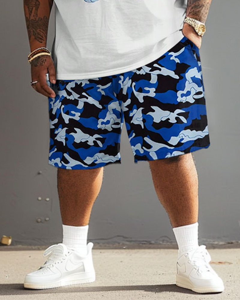 This camouflage big men's T-shirt and shorts set is designed for summer with a cute rabbit print. A blue camouflage bunny print design is full of fun and personality. Worry about body restriction? It's loose and comfortable. So, own the cute rabbit and own your style!