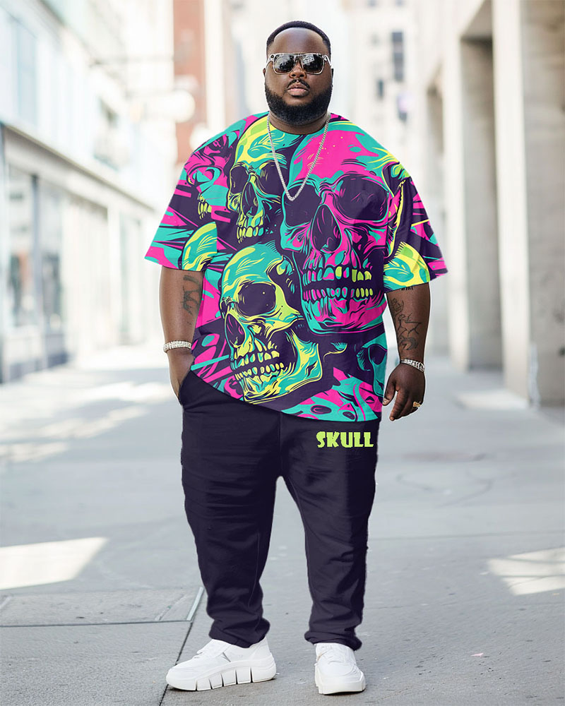 Men's Plus Size Street Fashion Abstract Graffiti Skull Print T-Shirt Trousers Suit