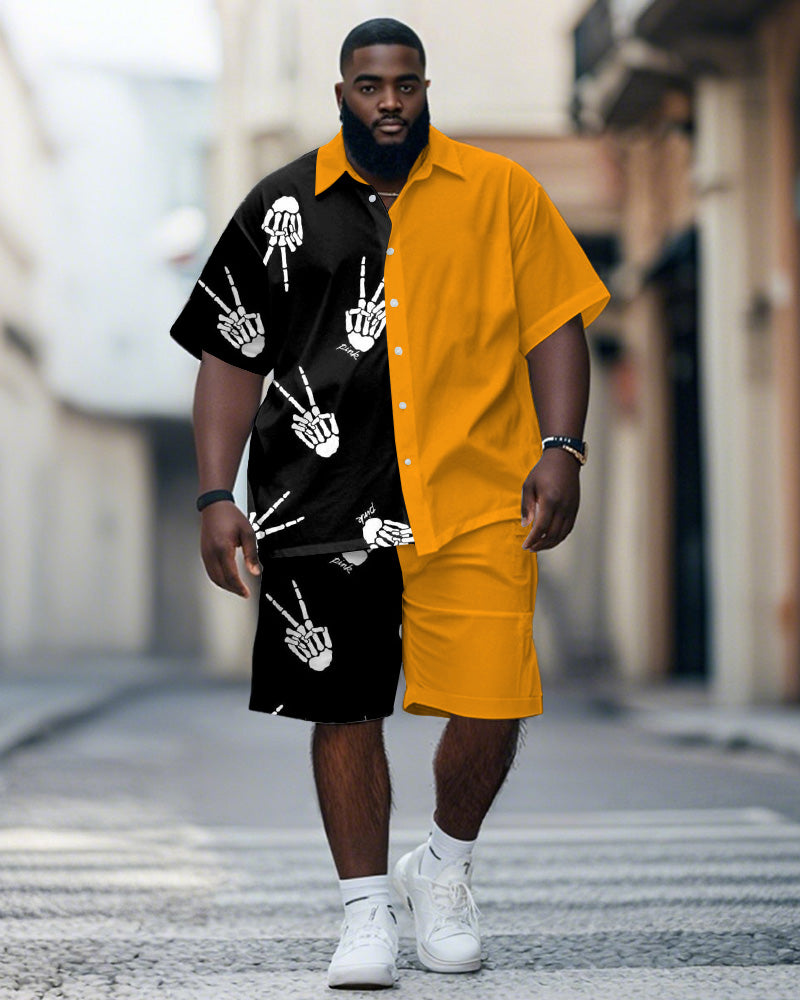 Men's Plus Size Street Fashion Black And Yellow Colorblock Skull Gesture Printed Shirt Shorts Suit