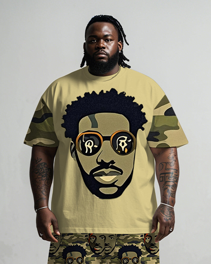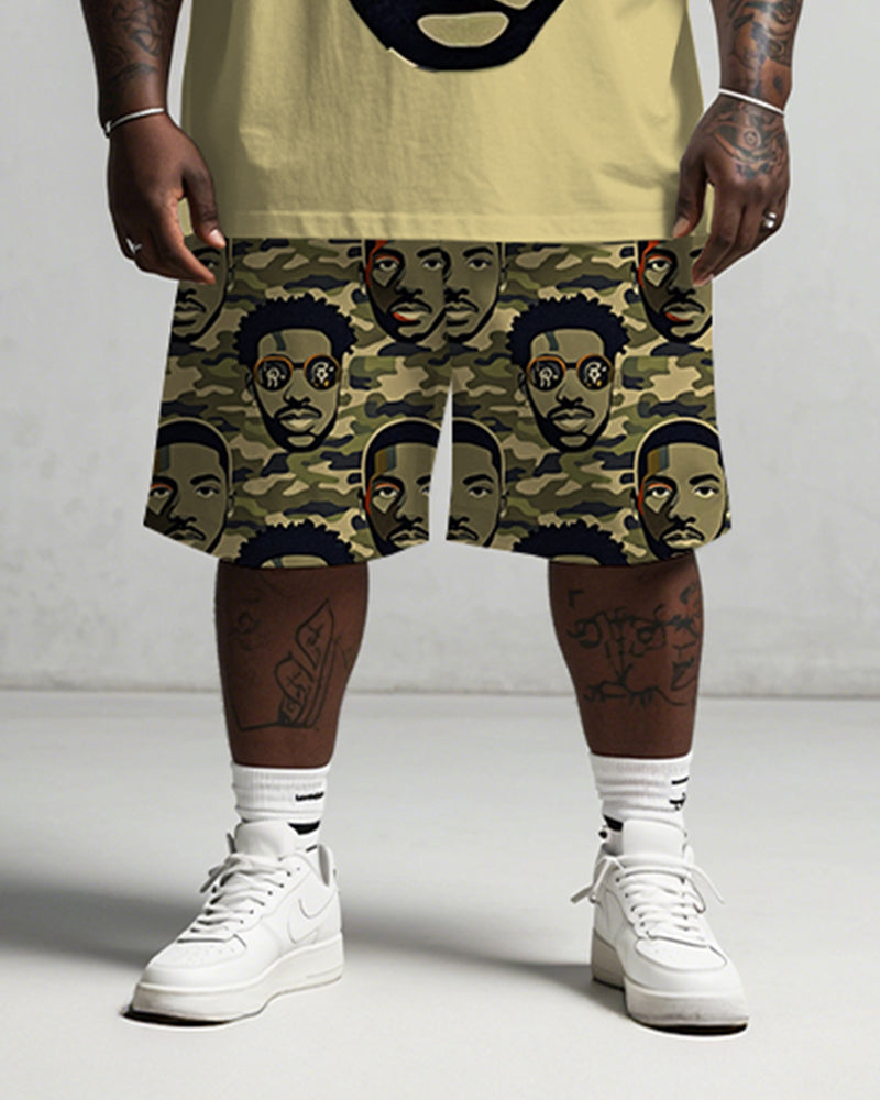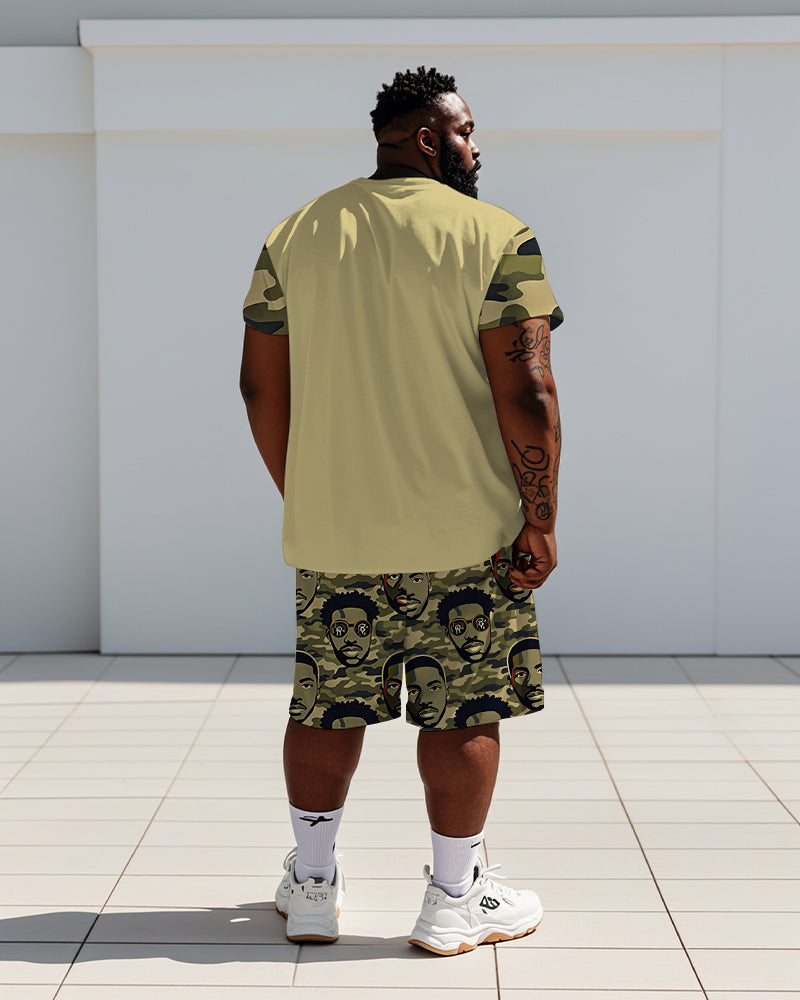 This men's plus size street fashion suit blends trendiness with comfort.The t-shirt and shorts are in a loose fit, making them super friendly to plus size figures. The personalized green camouflage print with a mysterious hip-hop avatar pattern creates a strong visual impact, making it easy to show off your unique attitude wherever you go.