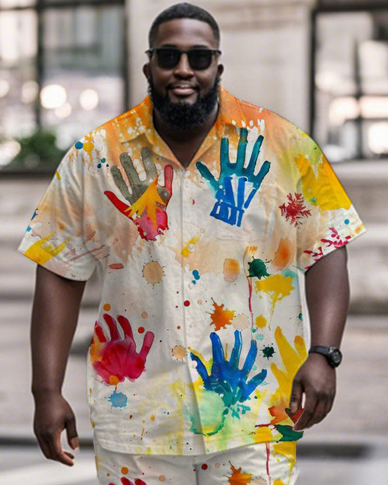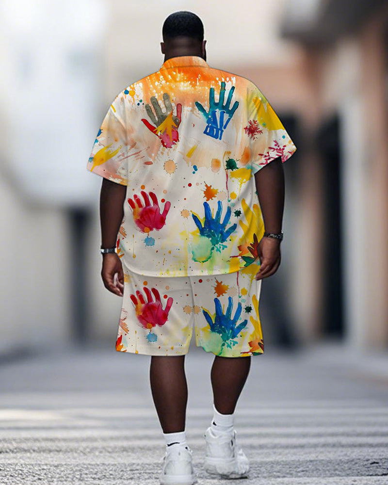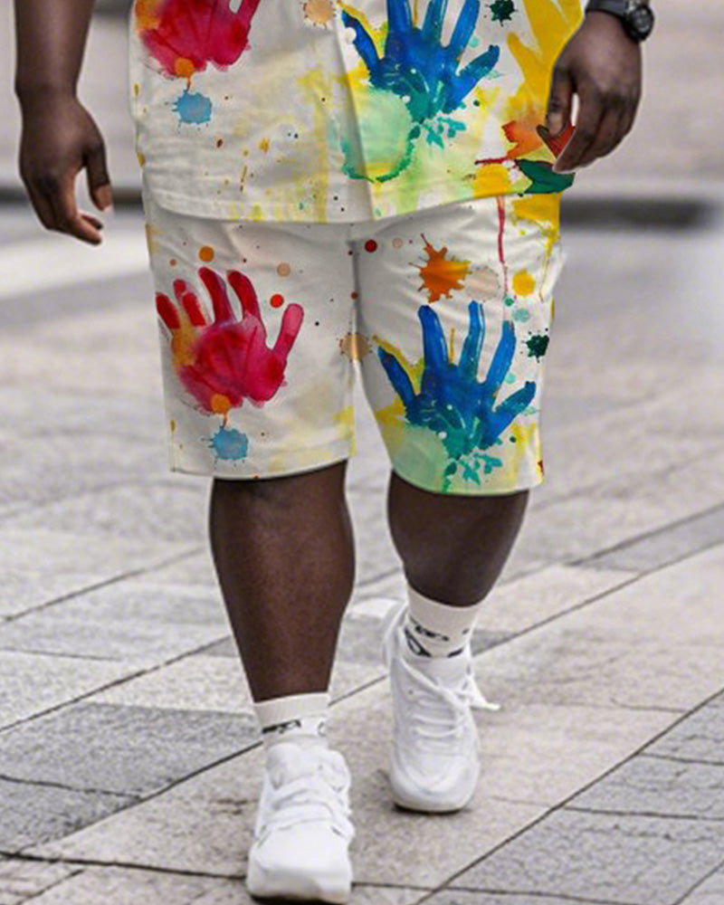 Men's Plus Size Street Fashion Colorful Graffiti Gesture Print Shirt Shorts Suit