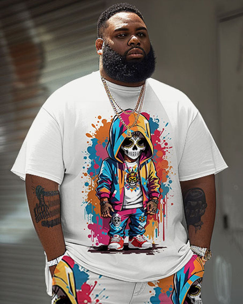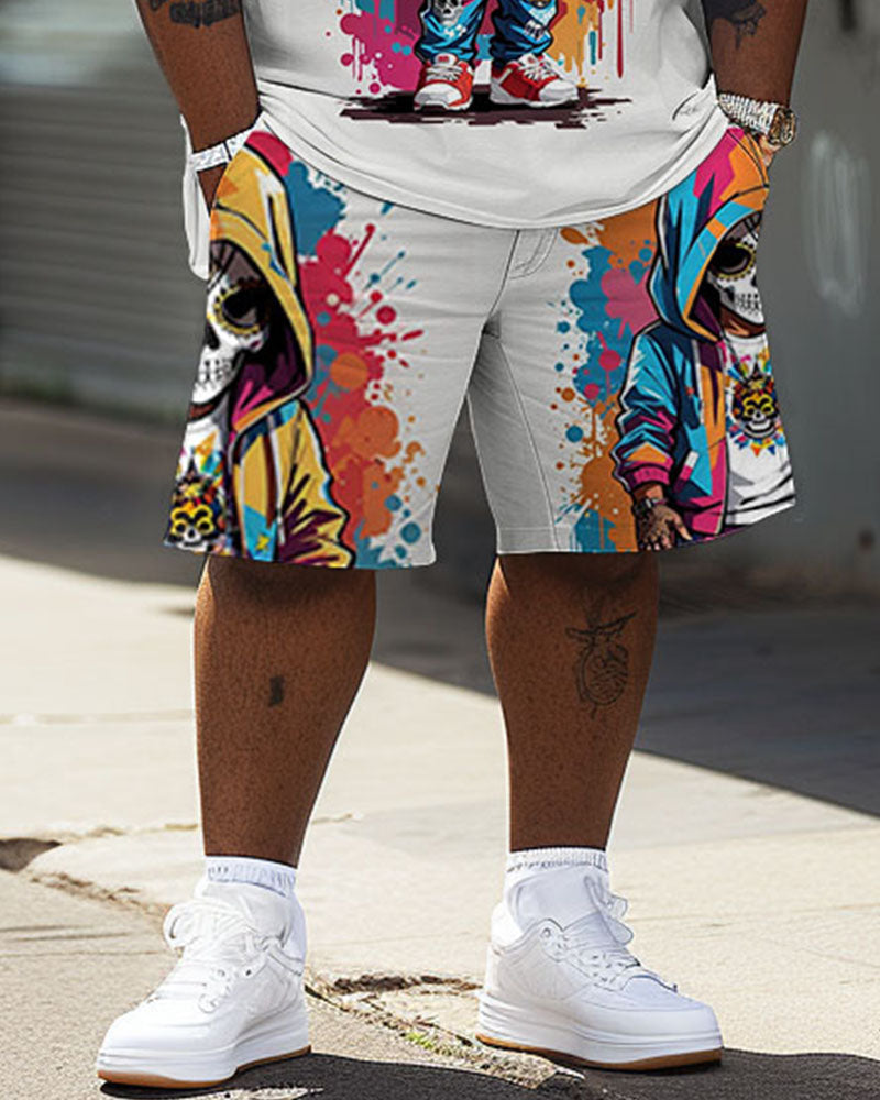 Men's Plus Size Street Fashion Colorful Graffiti Skull Print T-Shirt Shorts Suit