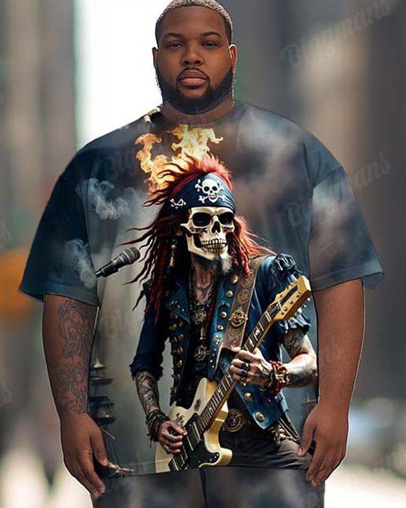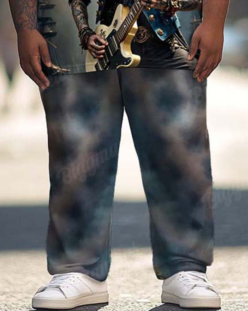 Men's Plus Size Street Fashion Graffiti Guitar Skull Print T-Shirt Trousers Suit