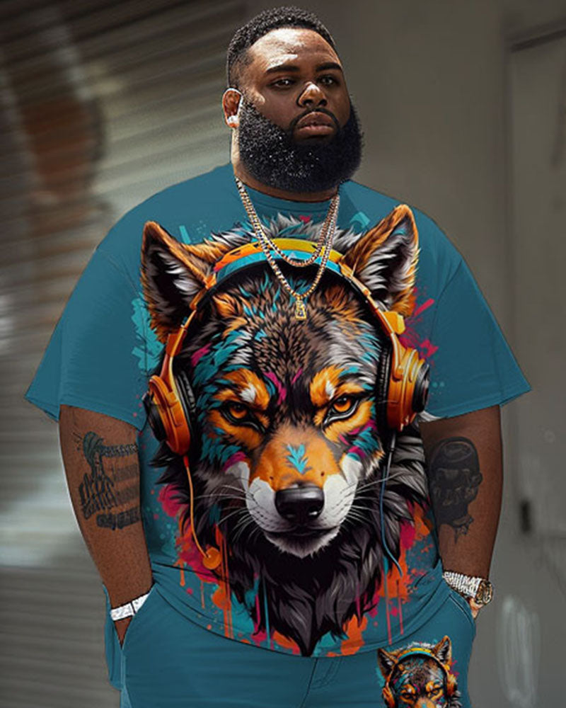 This blue two-piece set for big & tall men features a striking painted wolf head adorned with headphones for a vibe. Crafted with an artistic design, this outfit blends everyday comfort with daring fashion. Its loose fit ensures easy movement, making it ideal for casual wear.