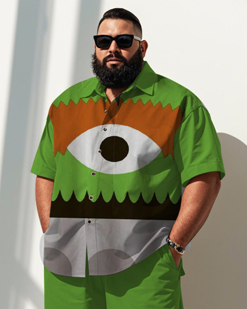 This men's plus size suit is full of street fashion. Fresh green color on the body, showing all the vitality. Unique cartoon fun glasses prints are all over the body, breaking the routine and full of novelty. Loose shirt and shorts combination, comfortable and casual, whether it is a daily outing or a casual party, you can easily become the focus.
