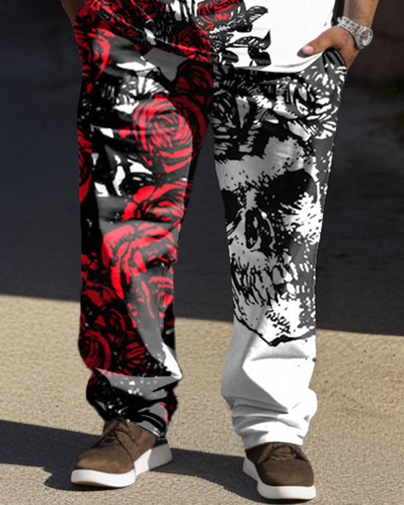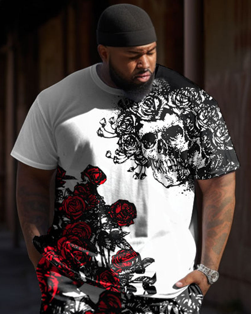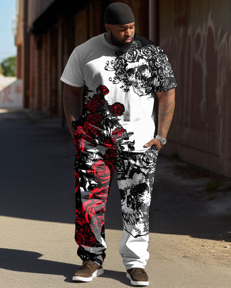 Men's Plus Size Street Fashion Skull Feather Rose Print T-Shirt Trousers Suit