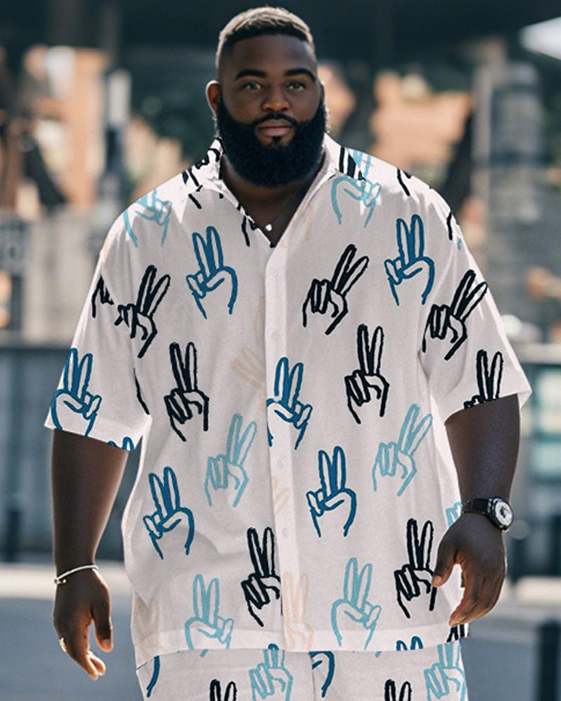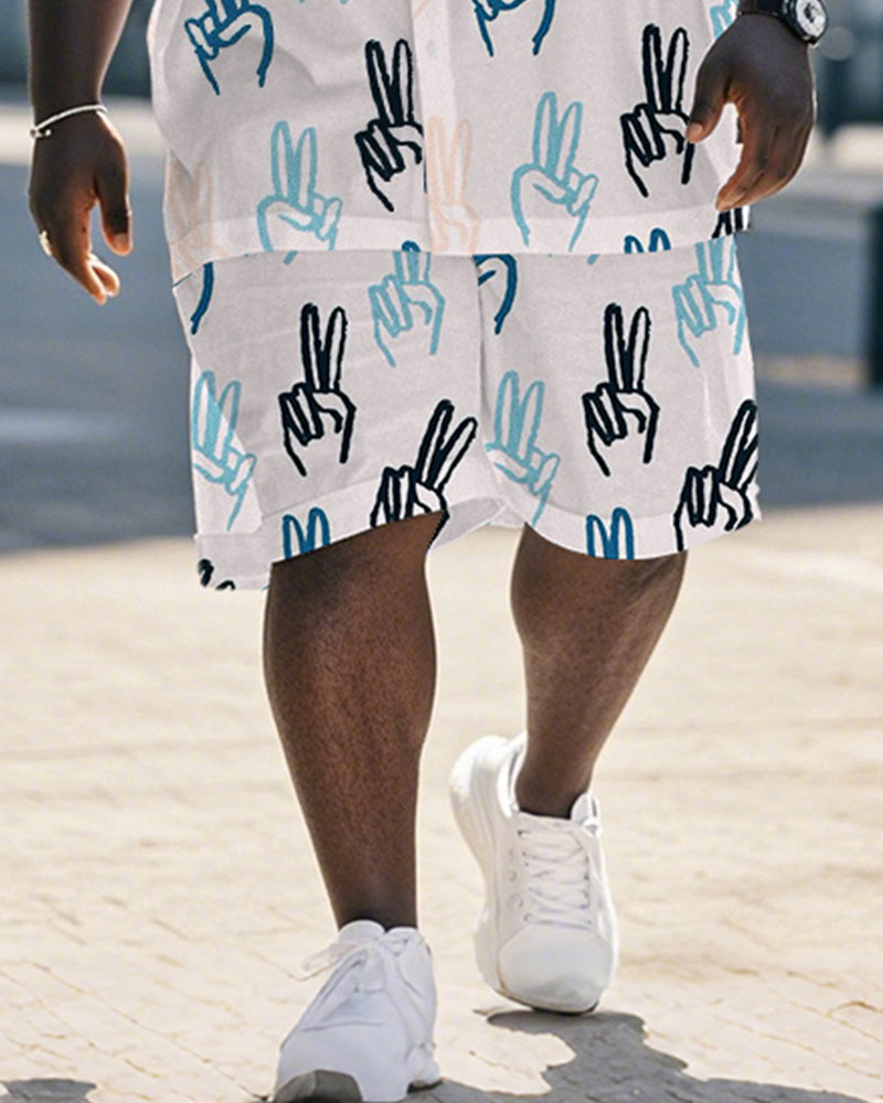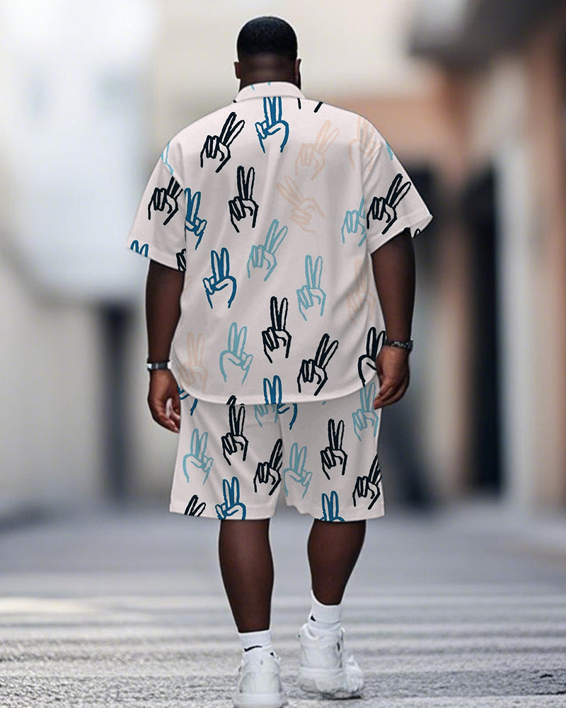 Men's Plus Size Street Fashion White Graffiti Gesture Print Shirt Shorts Suit