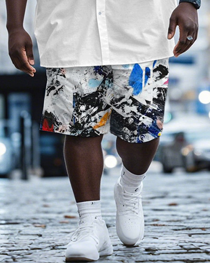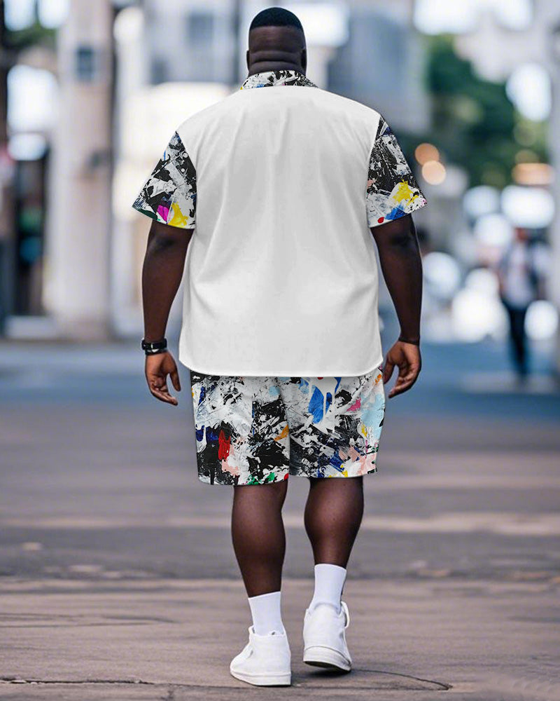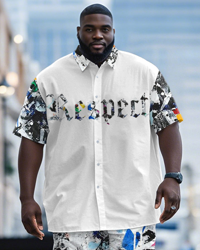 Men's Plus Size Street Fashion White Graffiti Respect Alphabet Print Shirt Shorts Suit