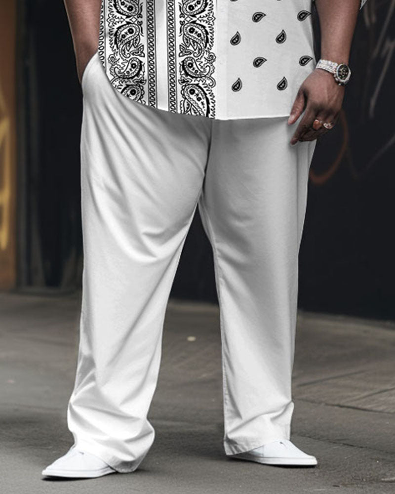 Men's Plus Size Street Fashion White Vintage Cashew Pattern Long Sleeve Shirt Trousers Suit