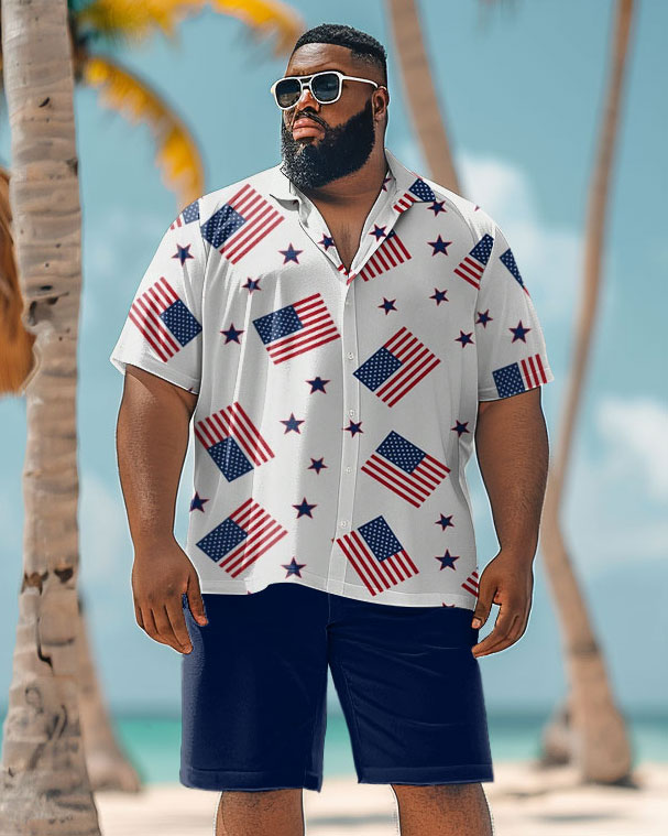 Celebrate in style with this two-piece set, inspired by . It features flag-inspired prints with stars, evoking a holiday vibe. Though festive in spirit, this set is versatile to wear beyond the holiday, making it a smart choice for various occasions. It's ideal for plus-size men seeking style and ease.