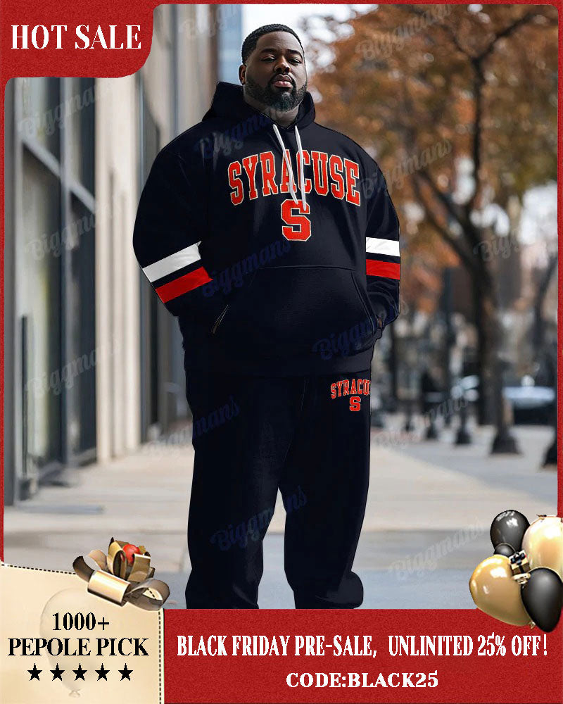 This men's plus size hoodie set features Syracuse University style. The striped colour block design is stylish and vibrant. The hood is practical and aesthetically pleasing, and the fit is relaxed. The print on the body incorporates elements of the university, highlighting the campus culture. The fine details and unique colour scheme make it comfortable to wear and show off a man's athleisure personality.