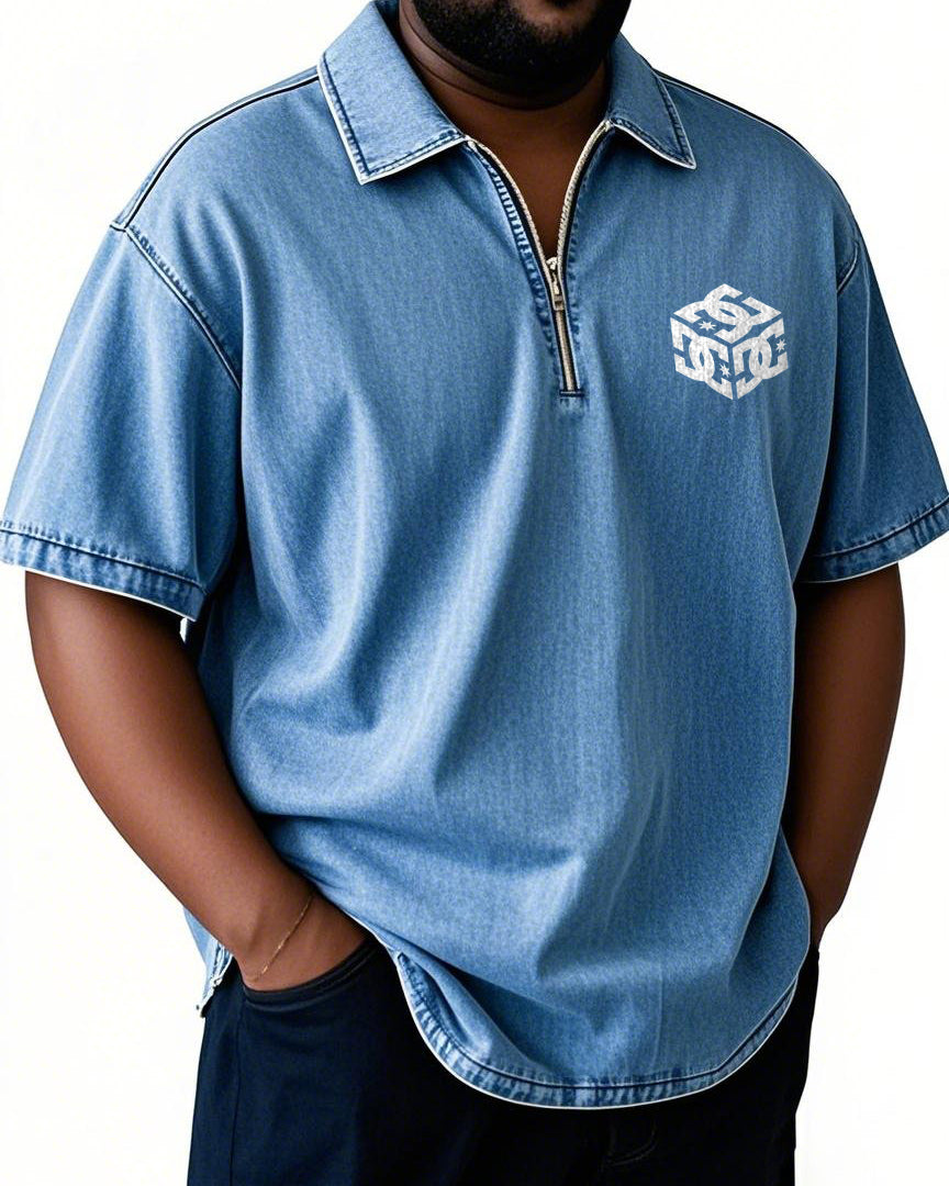 Men's Plus Size Three-dimensional White Letters Zipper Stand Collar Short Sleeve Shirt
