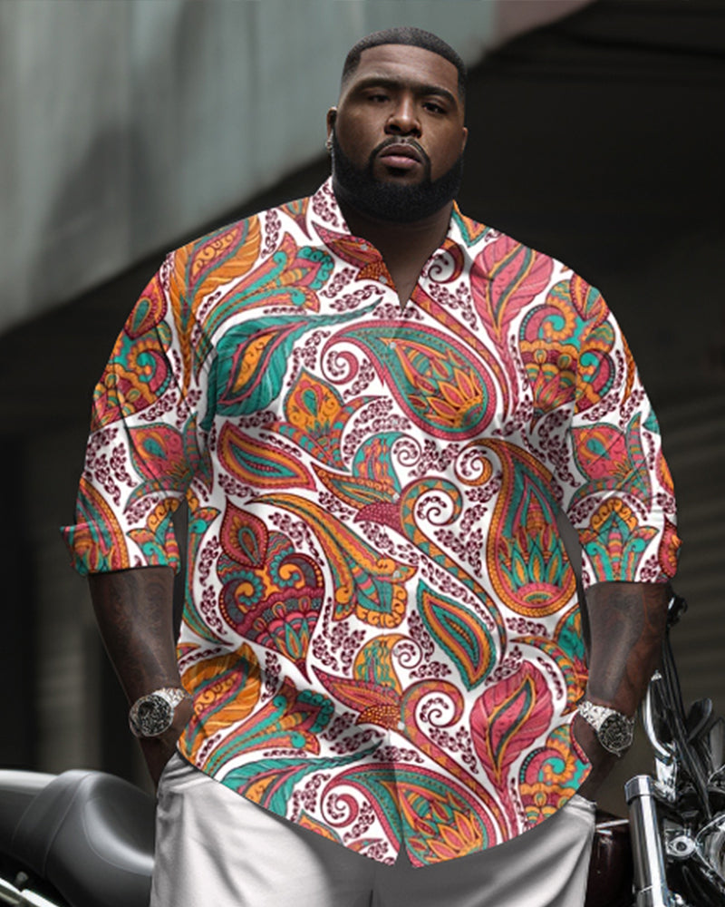 Men's Plus Size Vintage Cashew Flower Long Sleeve Lapel Shirt 2 Piece Set