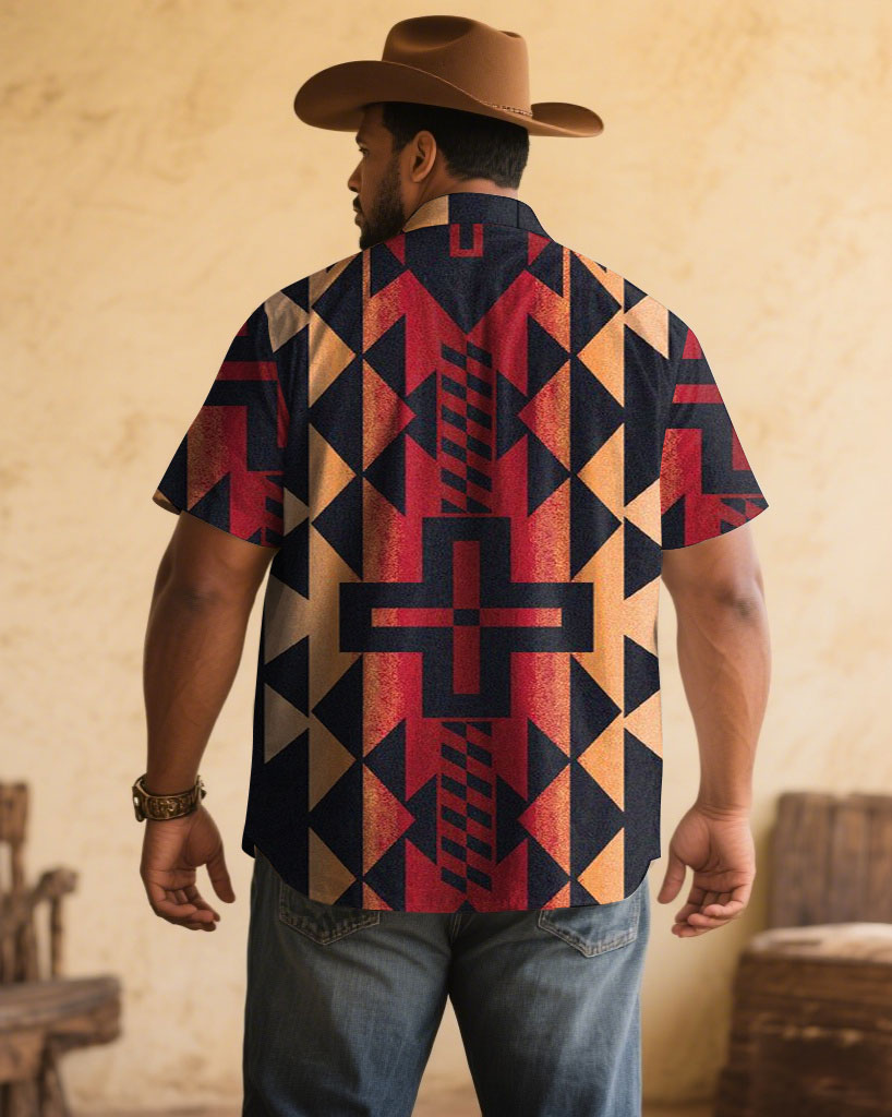 Men's Plus Size Western Denim Black & Red Printed Short Sleeve Shirt