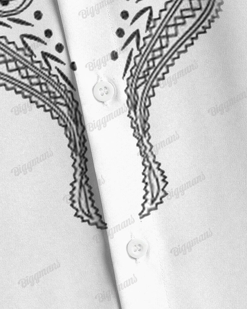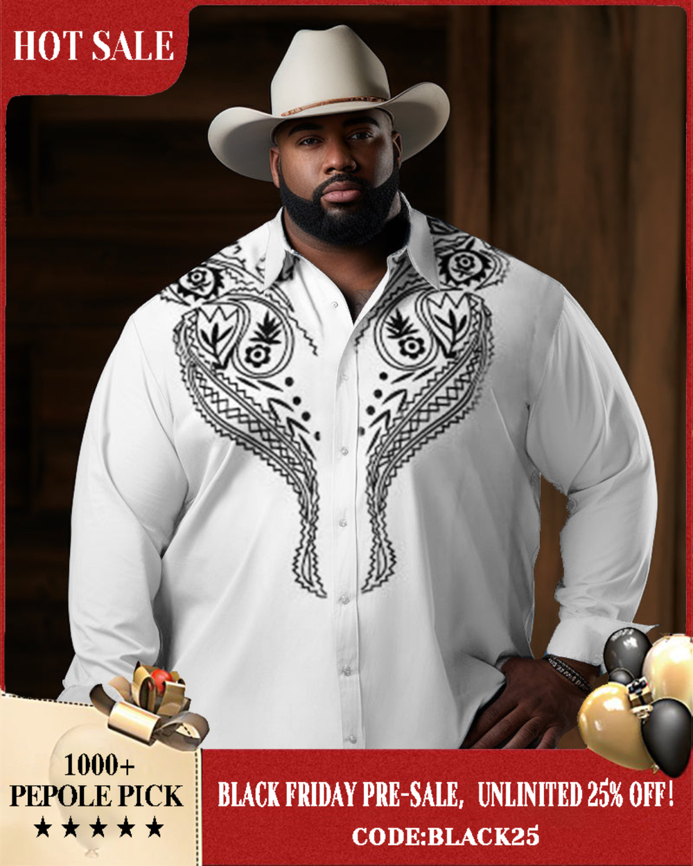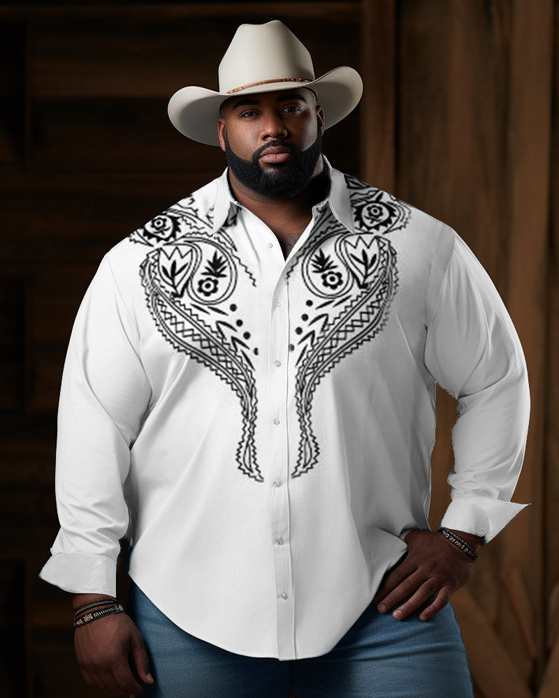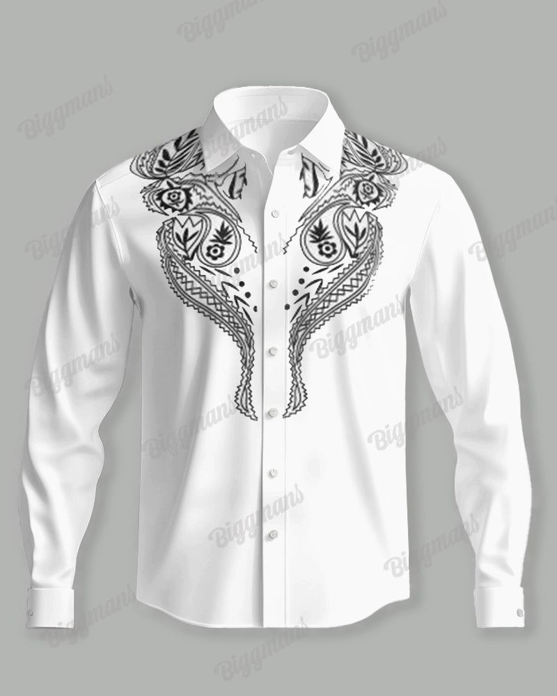 Elevate your wardrobe with our new western-style long-sleeved shirt. This classic white shirt features a bold, black, western-inspired pattern that adds a touch of rugged sophistication. Designed with a modern fit that accentuates your physique, this seamlessly blends comfort and style. Its versatility is your right-hand man.