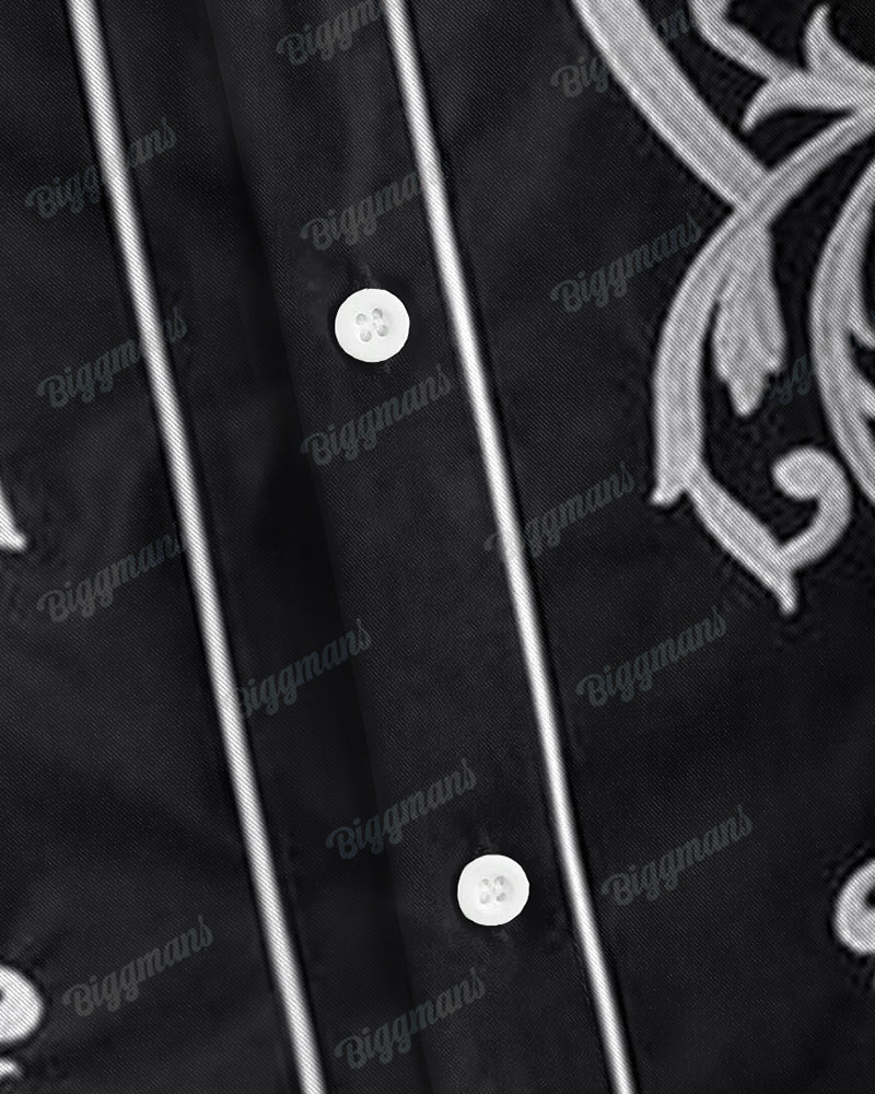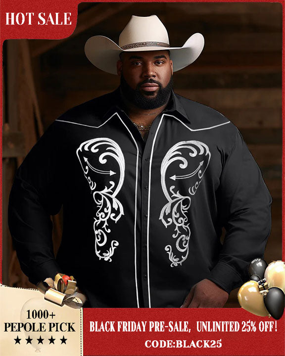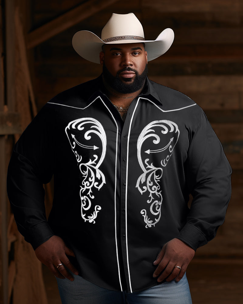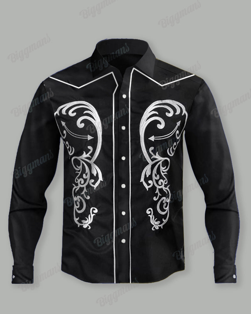This men's long-sleeved shirt combines western cowboy style with an embroidered design. The black background is matched with a unique white pattern print, showing a strong ethnic style. It comes with a variety of large-size options to ensure that every wearer can find the right size. Wear a Western shirt and explore the Western style!
