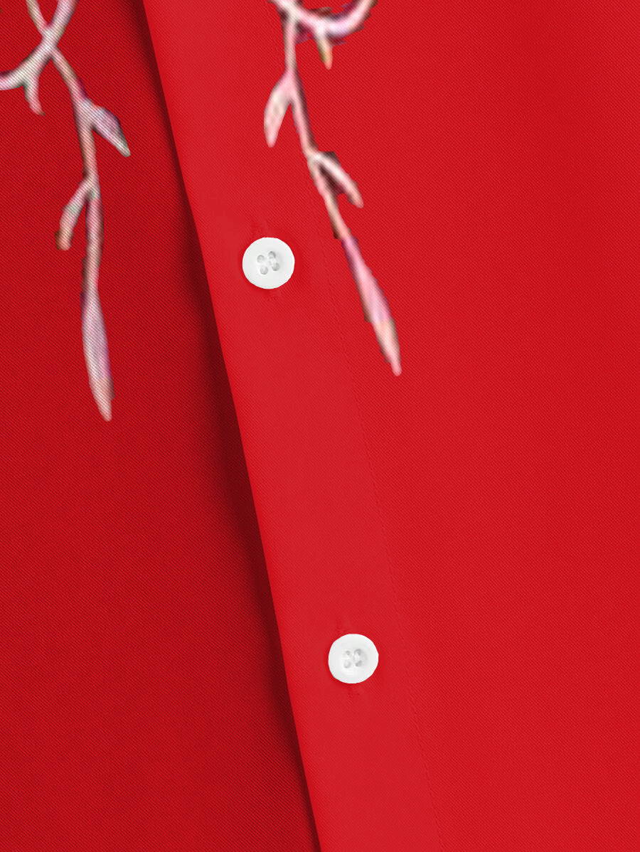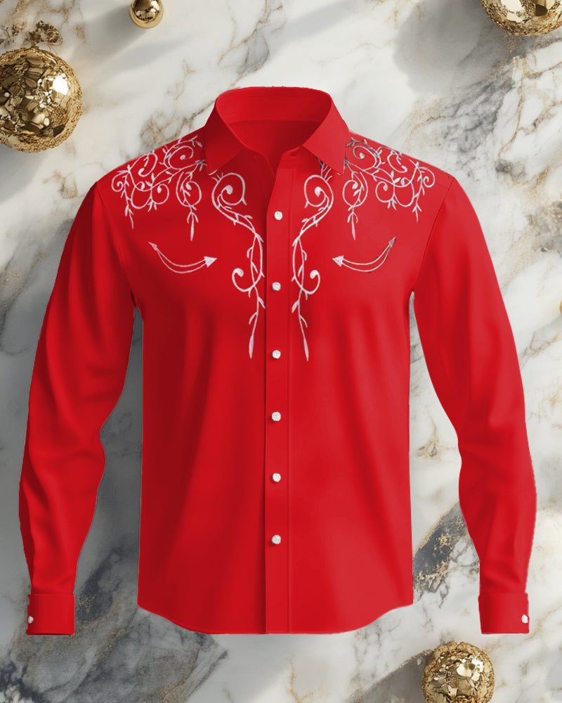 You'll turn heads in this red men's . With a white floral print and unique arrow pattern, you'll feel like you've stepped into the romance of a western garden. The relaxed fit makes it suitable for all seasons. This shirt blends classic and modern styles, making it a standout in any wardrobe.