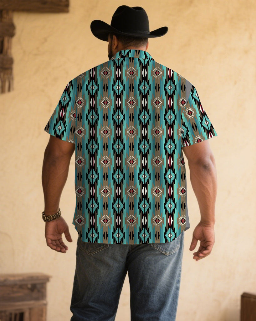 Men's Plus Size Western Denim-Print Short Sleeve Shirt