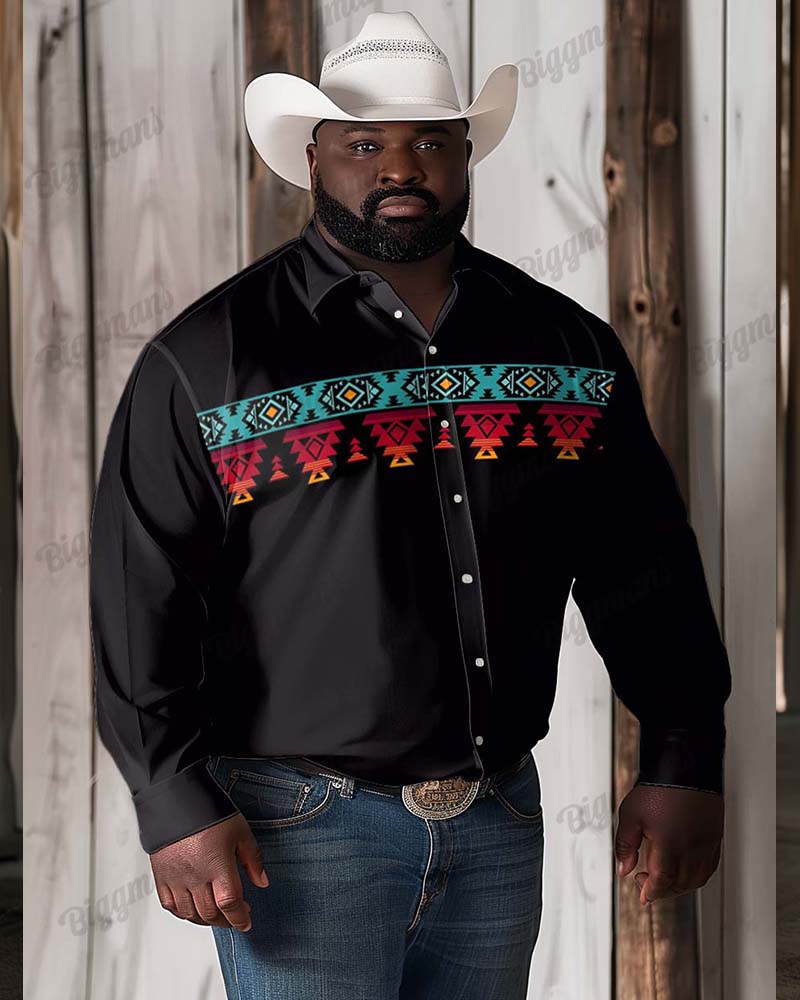 Embrace classic style with our big guy's Western long-sleeve shirts, featuring a Western retro tribal graphic. Designed for larger builds, this shirt combines a timeless Western flair with comfort, making it perfect for casual outings or a stylish night out.