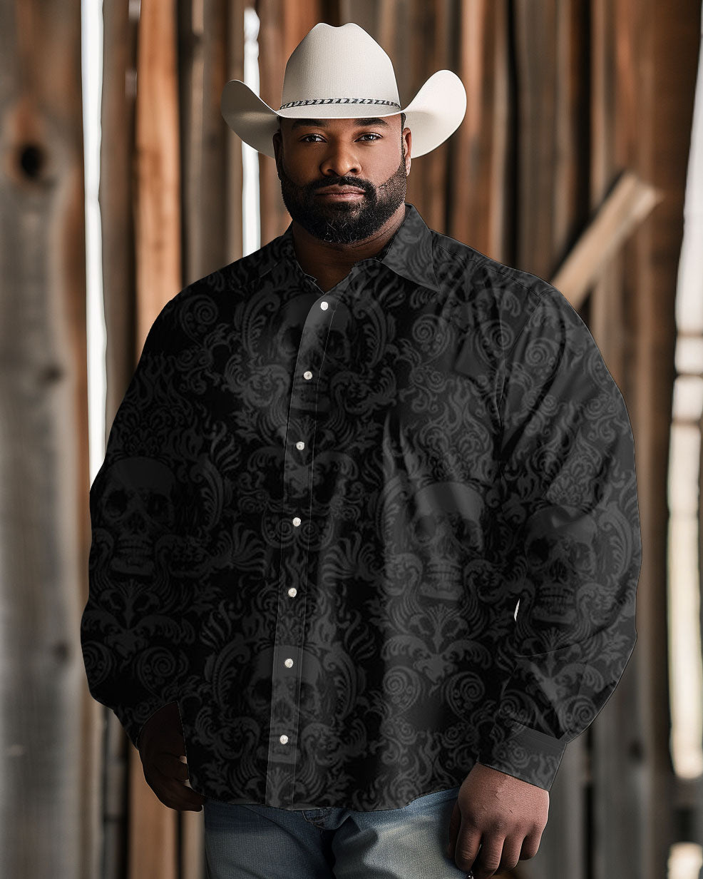 Embrace a touch of elegance with this black shirt, adorned in a Western-inspired, skull and floral print. Its relaxed fit and timeless appeal make it an effortlessly versatile choice, blending old-world charm with modern sophistication. It is perfect for those who pursue a refined style with a hint of nostalgia.