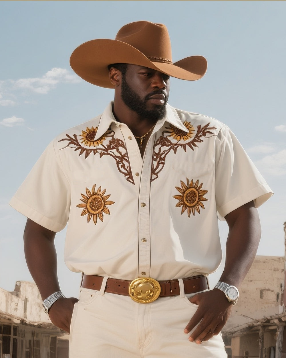 Men's Plus Size Western Denim Sunset & Textured Print Short Sleeve Shirt