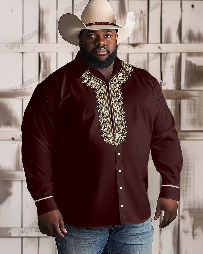 You'll turn heads in this wine red men's . With a golden geometric print, you'll feel like you've stepped into the romance of a western garden. The relaxed fit makes it suitable for all seasons. This shirt blends classic and modern styles, making it a standout in any wardrobe.