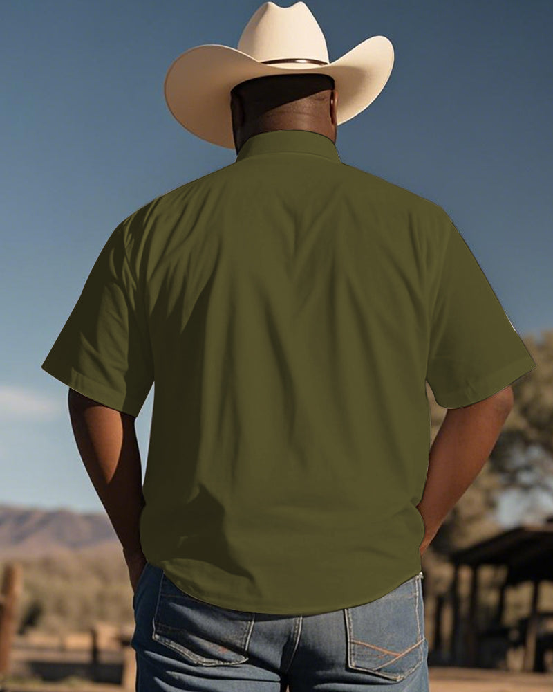 Men's Plus Size Western Style Green Patchwork Cactus Print Short Sleeve Shirt